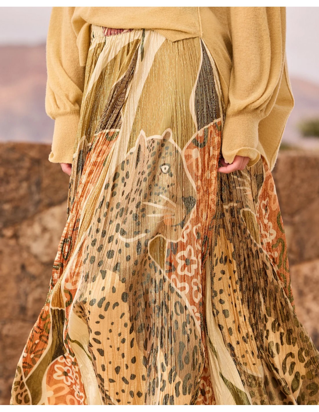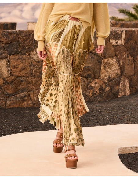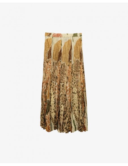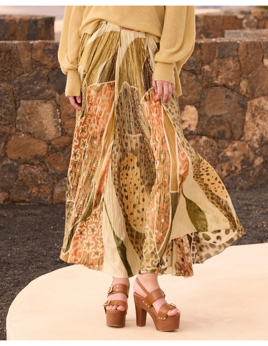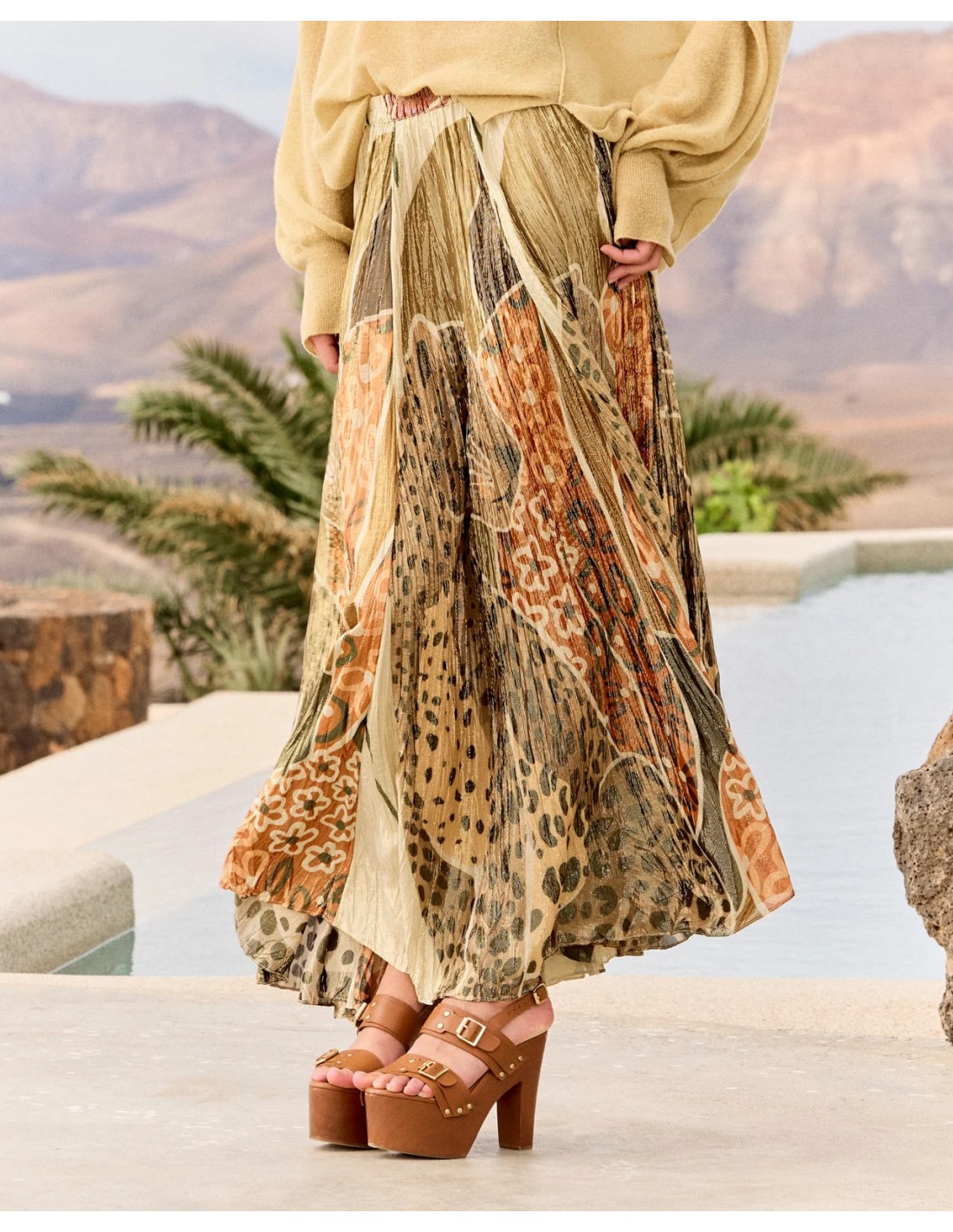 Descubre esta falda larga confeccionada en viscosa lurex con acabado plisado crinkled, que aporta un efecto ligeramente arrugado con un brillo sutil y cambiante a cada movimiento. Su diseño con estampado colocado en paneles verticales combina tonos armoniosos, jugando con la transparencia y los reflejos para crear una silueta elegante y dinámica. La cintura elástica garantiza un ajuste cómodo y una caída fluida.