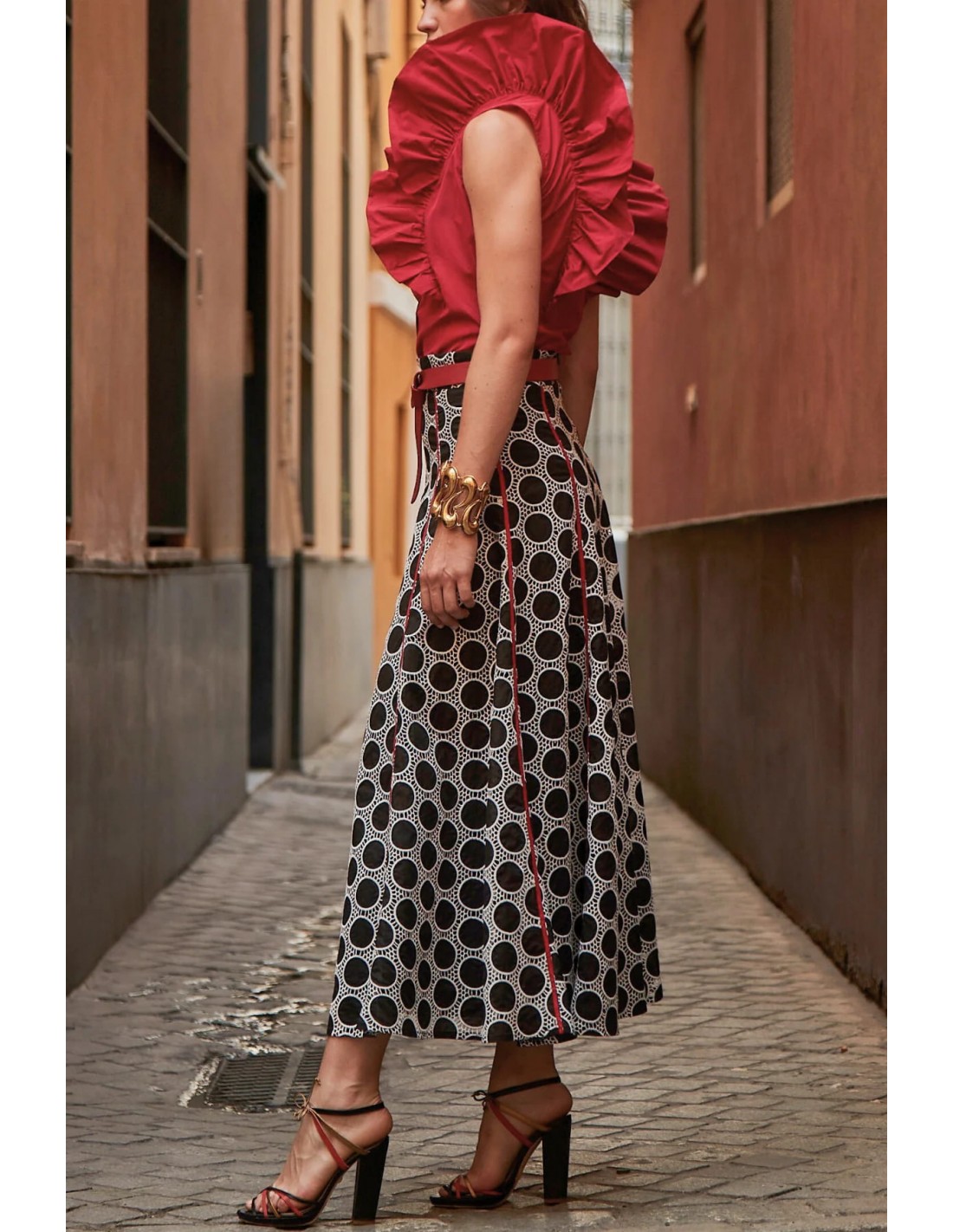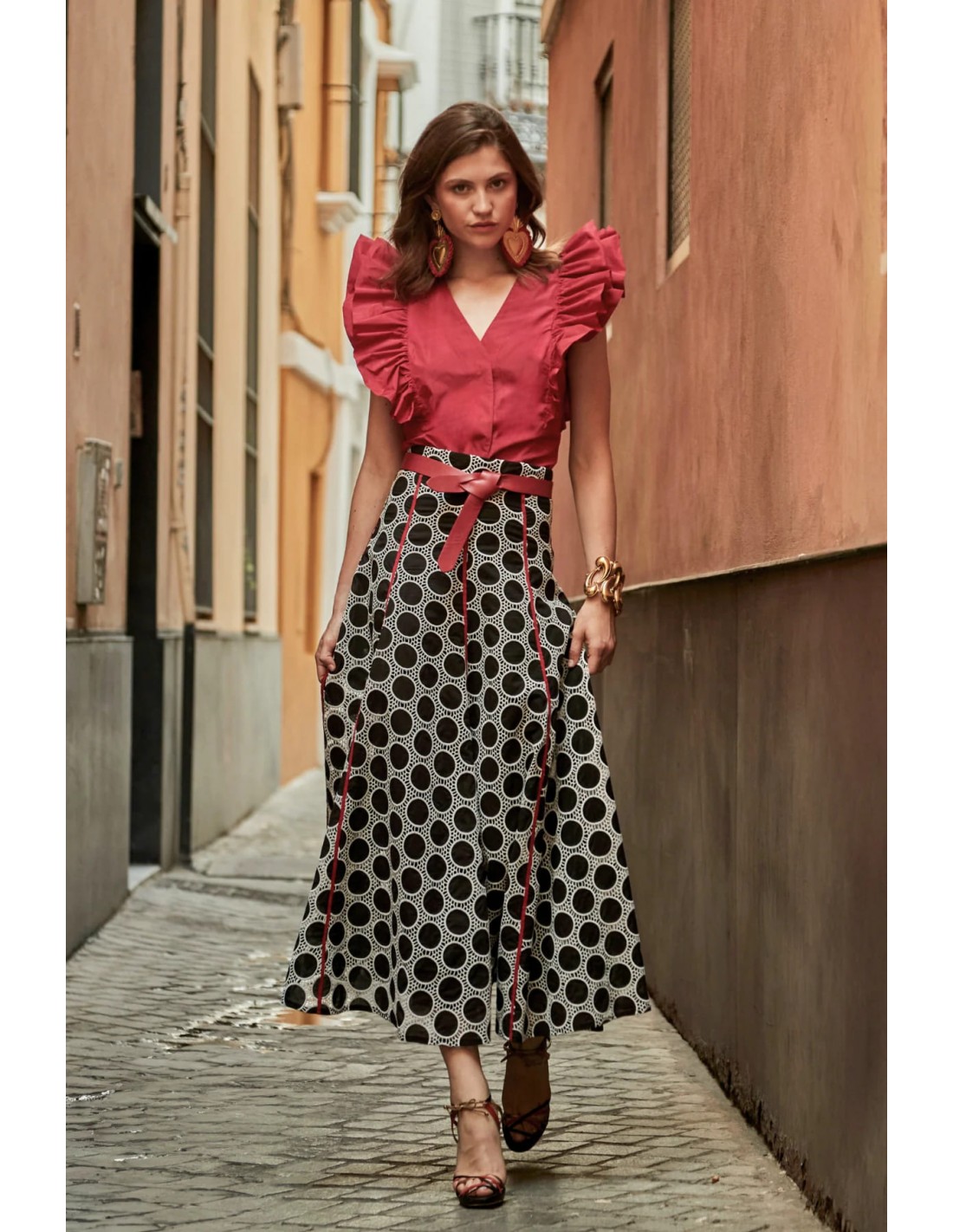 Descubre esta camisa de tafetán en color verde, una prenda elegante que destaca por su diseño limpio y contemporáneo. Su escote en V aporta un toque favorecedor, mientras que los volantes en los hombros y los frunces frontales añaden volumen y textura, creando una silueta con carácter.