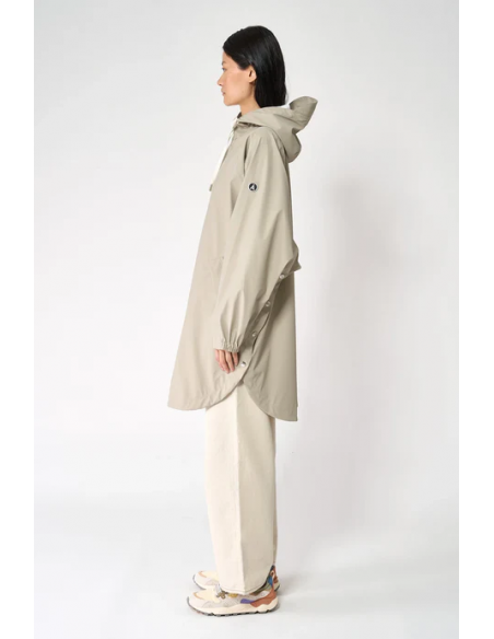 Su corte oversize proporciona comodidad y libertad de movimiento, mientras que los botones laterales a presión permiten ajustar el volumen y jugar con la silueta. Incorpora una capucha con visera y cordón, cuello alto, cremallera delantera impermeable, puños elásticos y bolsillos ribeteados. Las aberturas en las sisas mejoran la ventilación sin comprometer la protección.