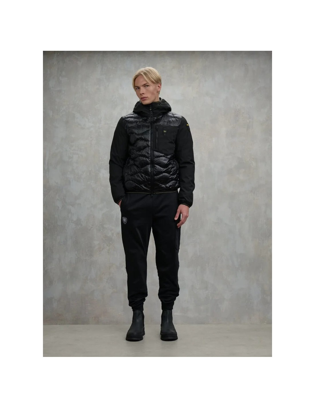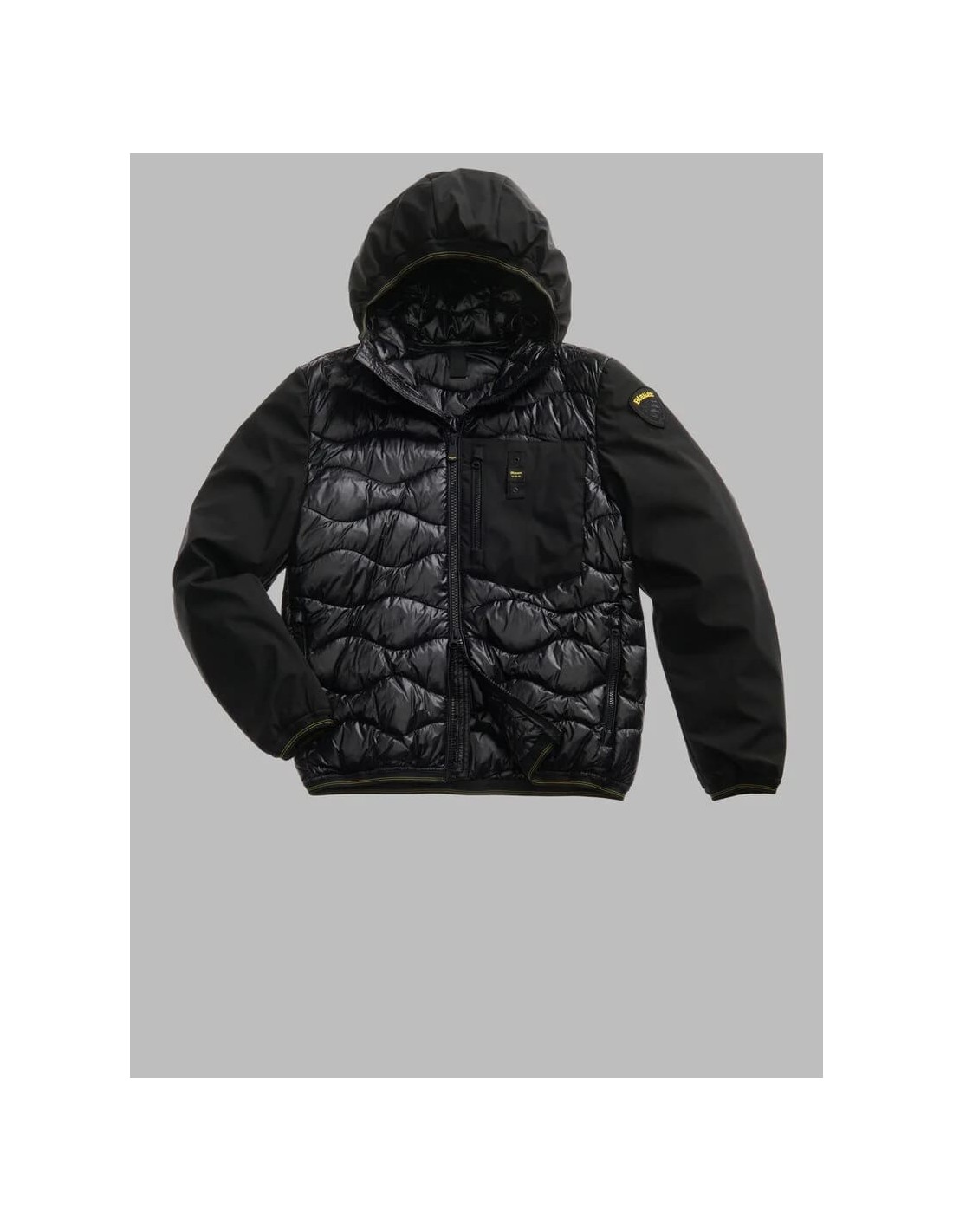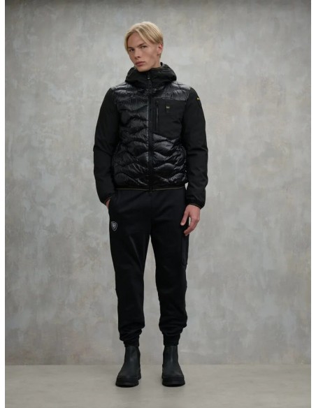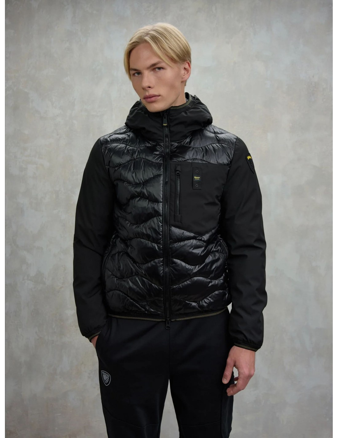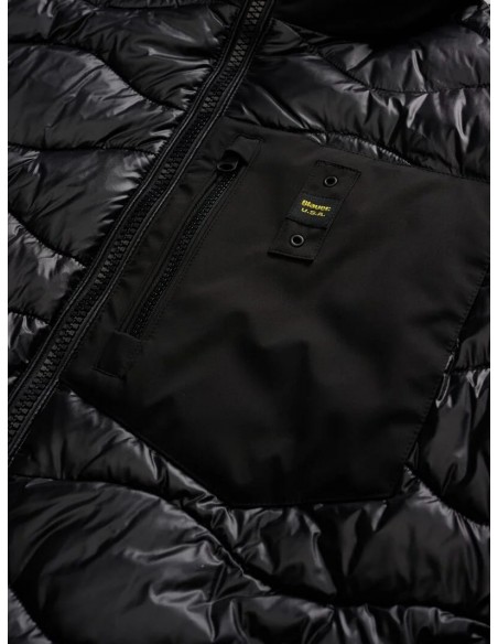 Chaqueta acolchada monocromática que combina mangas de neopreno suave y ligero con un cuerpo de nylon brillante y acolchado en ondas para un acabado moderno y funcional. Su relleno mixto —50% poliéster y 50% pluma— garantiza un excelente aislamiento térmico incluso en condiciones climáticas adversas. Incluye capucha fija, cierre de cremallera con protector en el cuello y bolsillos con cremallera, además de un bolsillo adicional en el pecho para mayor practicidad. El bajo, la capucha y los puños cuentan con ribetes elásticos que aseguran un ajuste cómodo y ceñido. En el interior, incorpora bolsillos con cierre de velcro para mantener tus pertenencias seguras. Remata el diseño un parche de logo y un loop característico que aportan un toque distintivo.