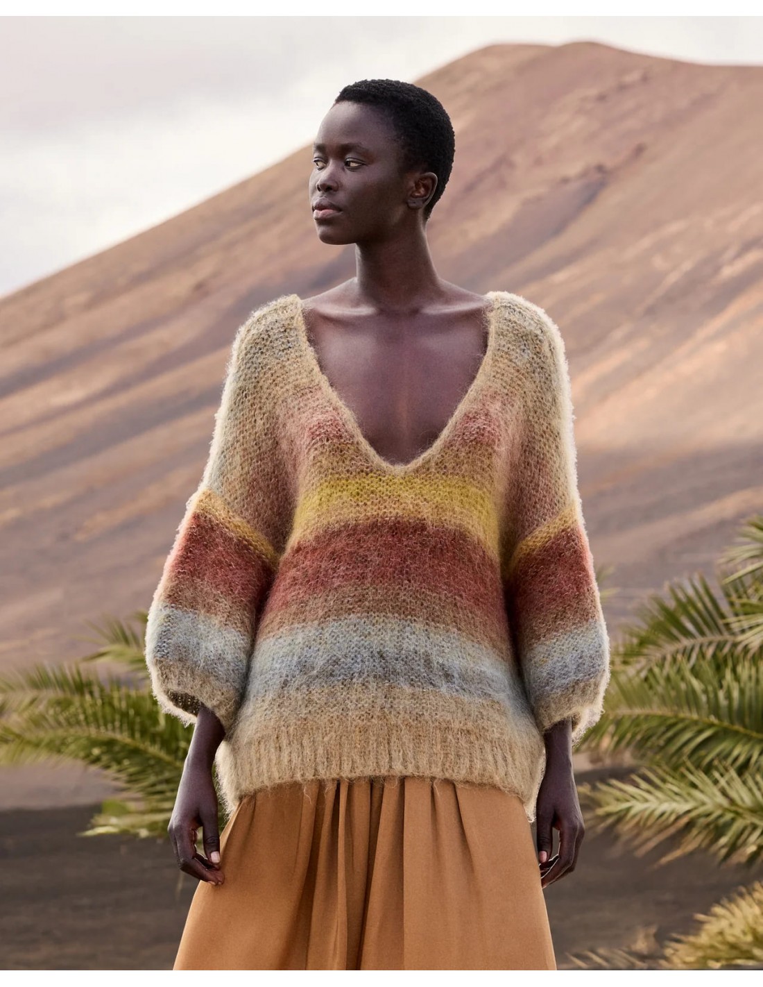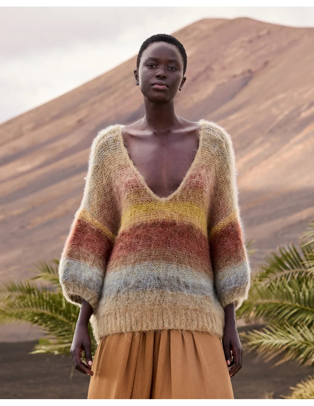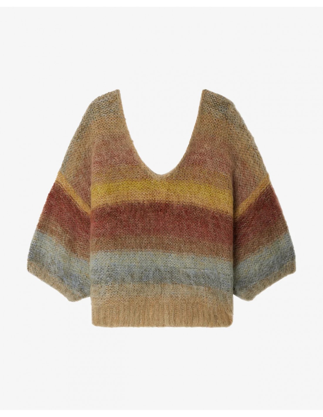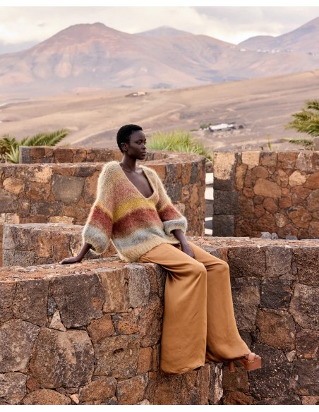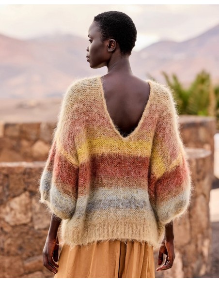 Descubre este jersey corto confeccionado en mohair cepillado, ligero y de tacto suave y envolvente. Su diseño con escote en V realza la silueta, mientras que las mangas cortas y voluminosas aportan un toque moderno y femenino. Tricotado a mano, presenta un delicado degradado en tonos kaki y ocre que evoca una paleta cálida y luminosa. El acabado del cuello en crochet añade un detalle artesanal que refuerza su carácter exclusivo.