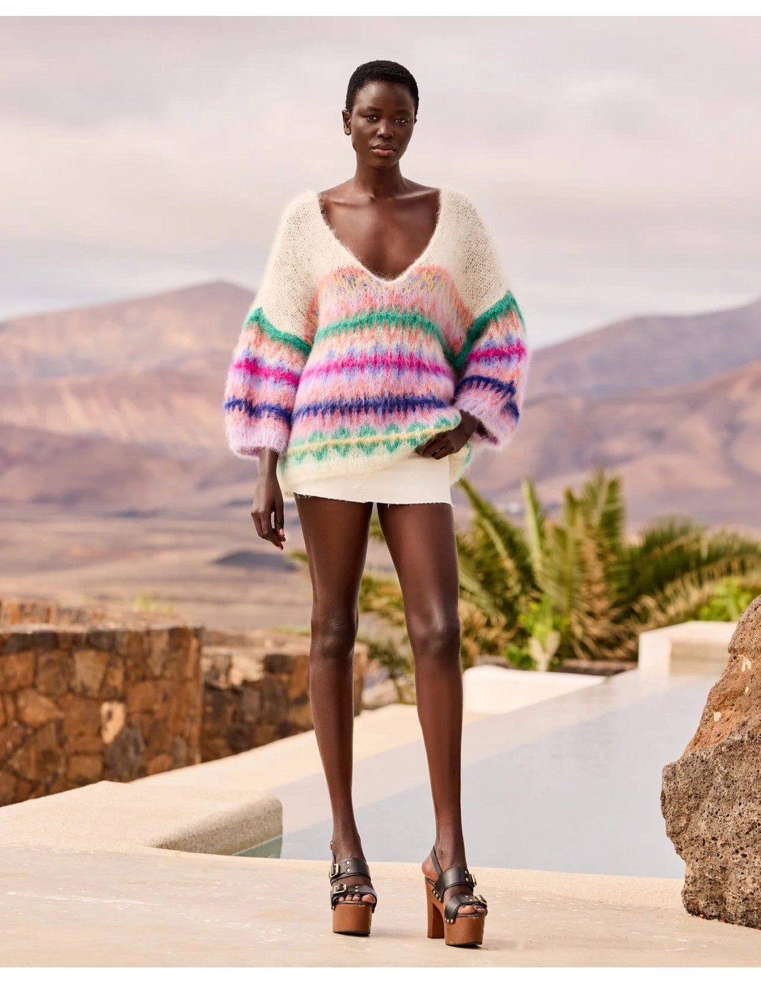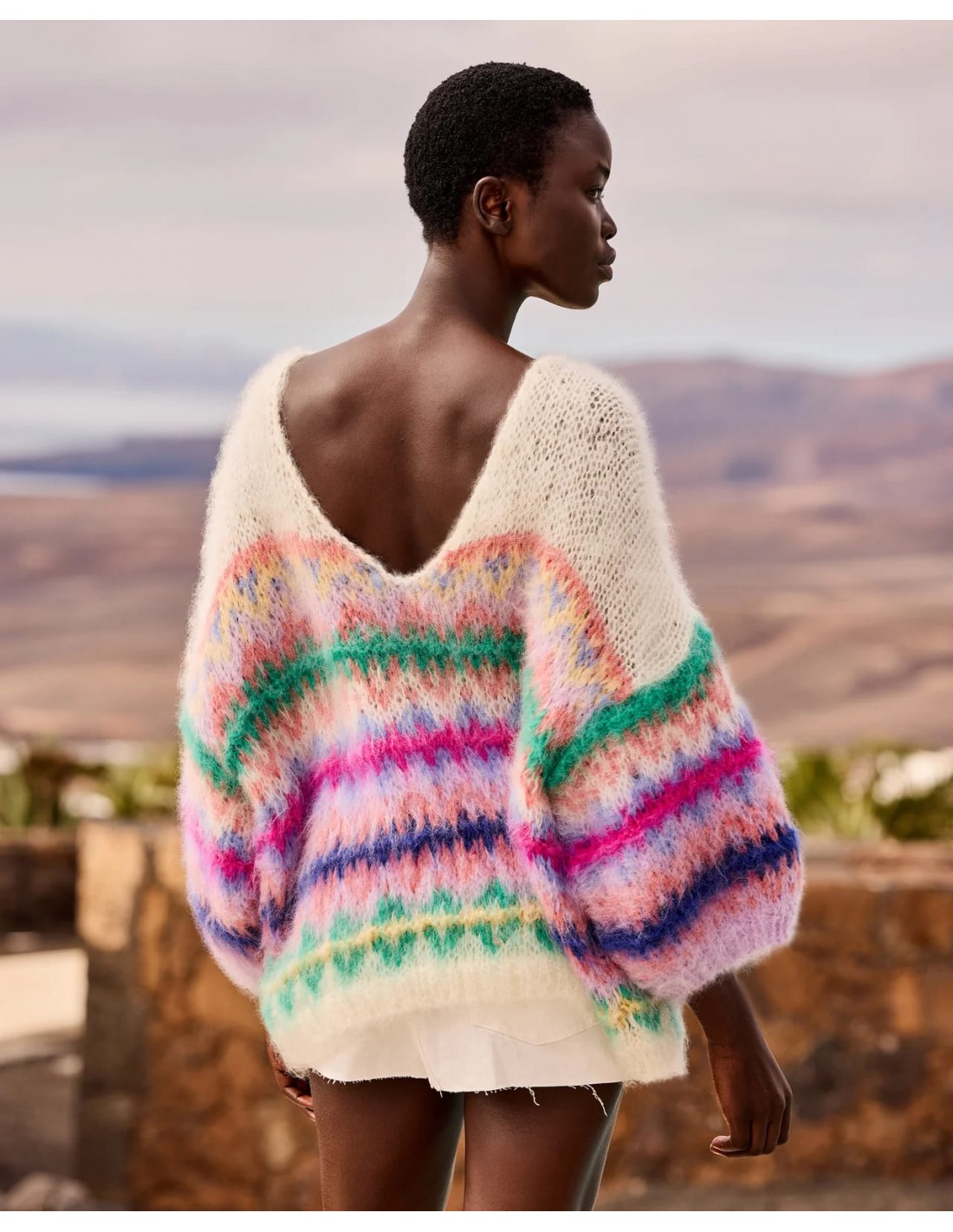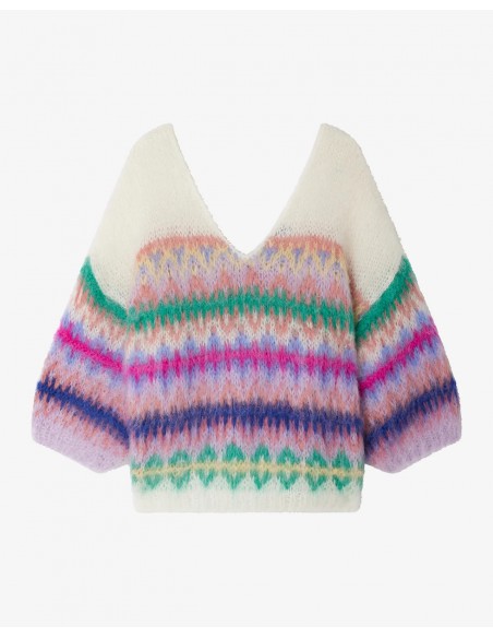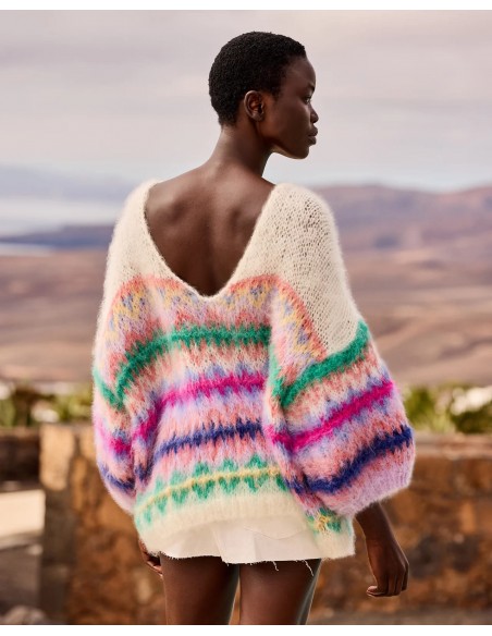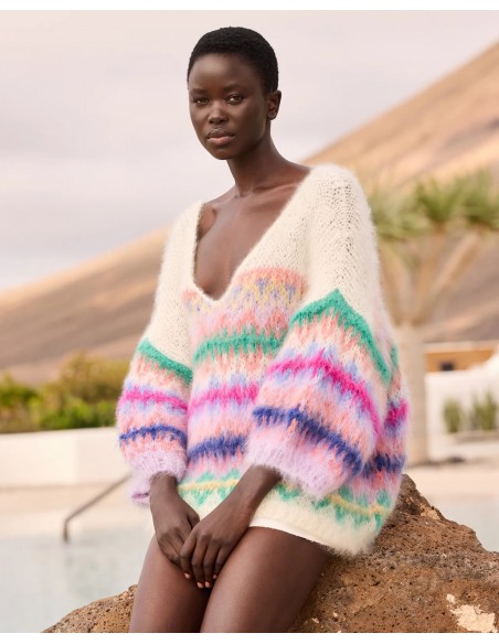 Su diseño presenta un motivo jacquard nórdico tradicional reinterpretado en un vibrante colorido “Happy Pop”, combinando tonos verdes, rosas, violetas y azules sobre fondo marfil, aportando un aire único y lleno de personalidad.