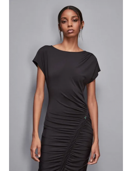 El vestido midi con fruncido de Patrizia Pepe es una propuesta refinada que equilibra modernidad y elegancia. Confeccionado en jersey de crepé de poliéster, este modelo abraza la silueta con un corte ajustado que se alarga hasta la pantorrilla, favoreciendo la figura con una estética limpia y contemporánea.