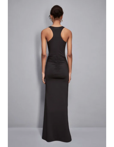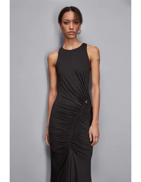 El vestido largo con fruncido de Patrizia Pepe es una prenda que realza la figura femenina con una elegancia refinada. Confeccionado en jersey de crepé elástico, este vestido de largo hasta el suelo abraza el cuerpo con un corte ajustado que destaca cada línea con sutileza y sofisticación.