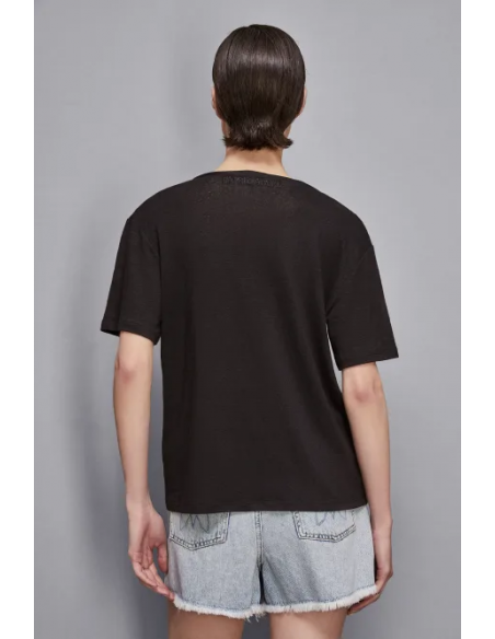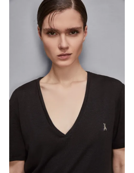 Su escote en V estiliza el cuello y añade un toque femenino, mientras que el corte normal y las mangas cortas la convierten en una opción ideal para el día a día. El bordado Patrizia Pepe junto al icónico detalle Fly completan el diseño con un sello distintivo de la marca.