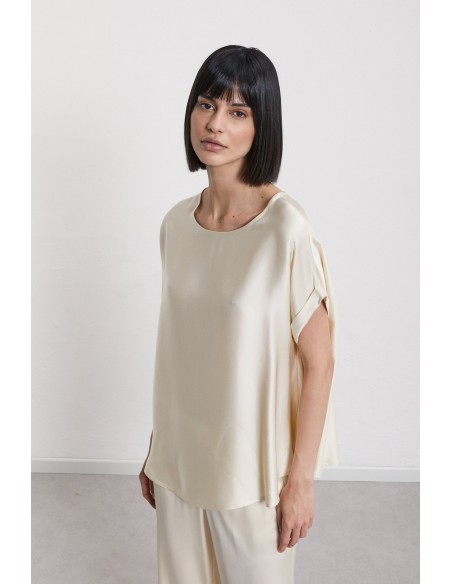 La blusa fluida asimétrica de Ottod’Ame es una pieza esencial con un toque de originalidad. Confeccionada en 100% viscosa, su tejido suave y ligero proporciona una sensación de frescura y movimiento natural. El diseño destaca por su bajo asimétrico, que aporta dinamismo y modernidad al conjunto, y por su silueta relajada, ideal para estilismos sofisticados o informales. Puedes combinarla con pantalones sastre, vaqueros o faldas, logrando looks versátiles de día o de noche. Perfecta para quienes buscan una prenda cómoda, femenina y con carácter, sin renunciar a la elegancia.