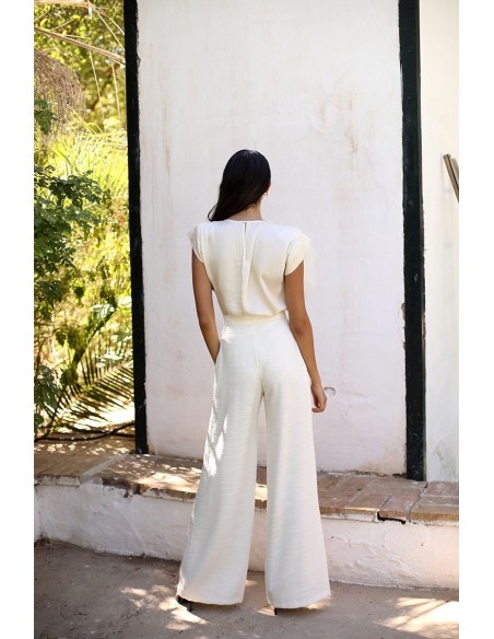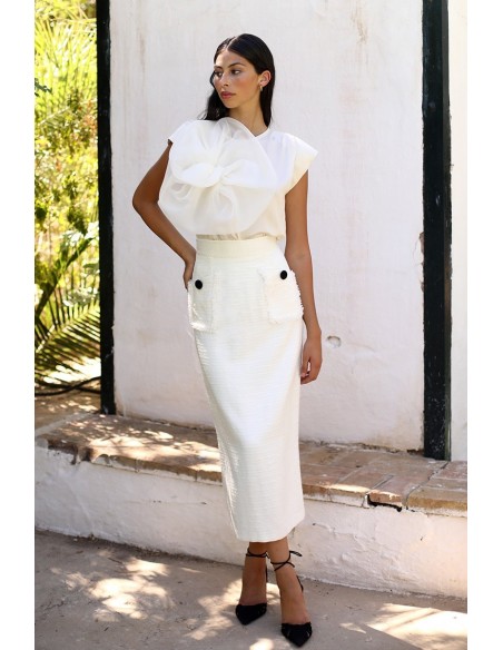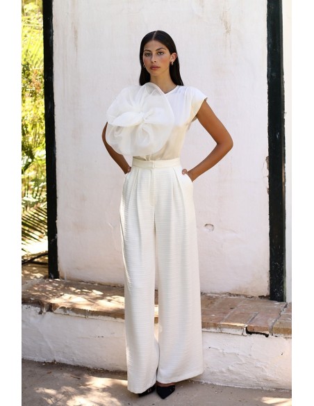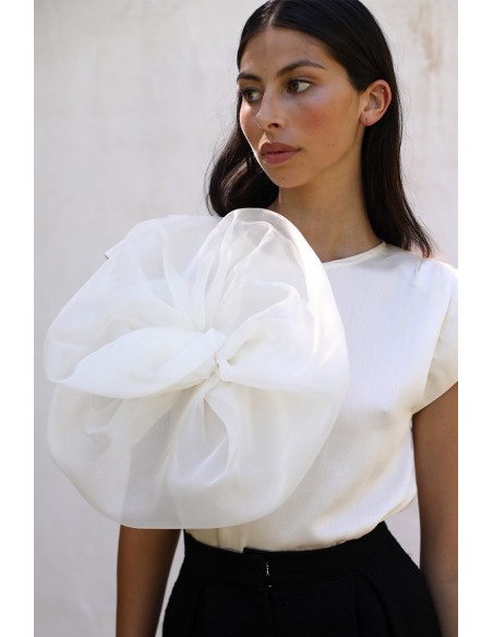 La pieza más distintiva de la nueva colección de verano de Panambi, Esta camisa es una de las piezas más especiales de esta colección gracias a la manga con flor tan distintiva. Esta confeccionada en satén de seda con maxi flor en organza de seda.