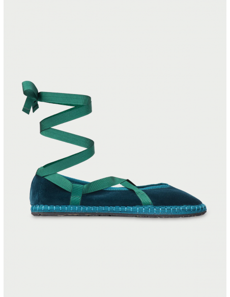 Bailarina en terciopelo de algodon verde petróleo con ribetes en verde petróleo y lazadas cruzadas para atar al tobillo con cintas de color verde botella. El exterior del zapato es 100% terciopelo de algodón, y el interior del zapato es 100% algodón ecológico con tratamiento antibacteriano. La suela es de goma producida con neumáticos de bicicleta reciclados. Las Flabelus surgen de la fusión entre dos zapatos tradicionales: la alpargata española y la veneciana italiana, resultando un zapato cómodo, resistente, atemporal y muy versátil para la mujer de hoy en día.
