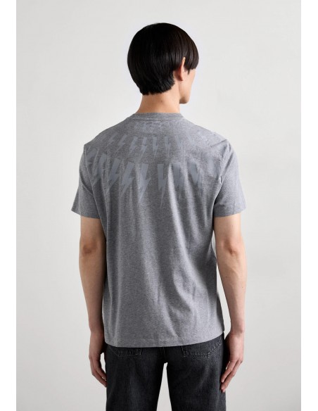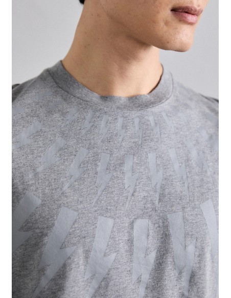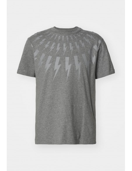 Esta camiseta presenta un diseño minimalista y moderno. Está confeccionada en un material suave y cómodo. La característica más destacada es un patrón gráfico en forma de rayos que se despliega desde el cuello hacia el pecho, creando un efecto visual interesante y dinámico característico de la marca Neil Barret.