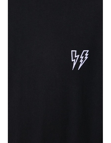 Destaca un pequeño y elegante gráfico de rayos en el lado izquierdo del pecho, añadiendo un toque distintivo y sutil al diseño minimalista. Esta camiseta es ideal para quienes buscan una prenda versátil que combine con cualquier atuendo, manteniendo siempre un aire de sofisticación y modernidad.