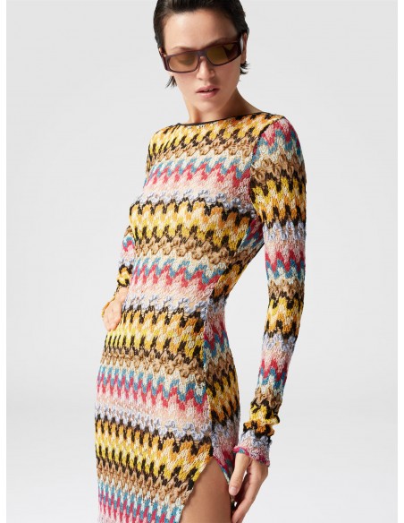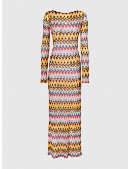 Este Vestido Largo de Encaje Lamé de Missoni es un homenaje a la sofisticada elegancia y la artesanía excepcional de la maison. El patrón en zigzag, iluminado por el brillo del lamé, crea un efecto luminoso y dinámico que capta la atención con sutileza.