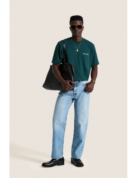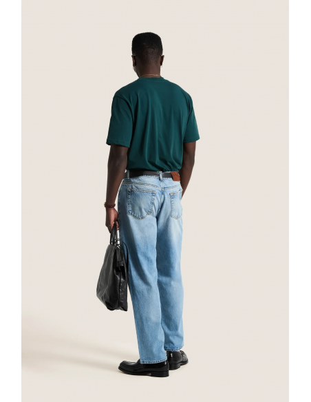 El tejido elástico (97% algodón, 3% elastano) permite libertad de movimiento sin sacrificar la estructura, mientras que los detalles vintage y las costuras dobles meticulosas reflejan la atención al detalle característica de la marca. Su acabado ligero y su corte versátil los convierten en un básico moderno imprescindible.