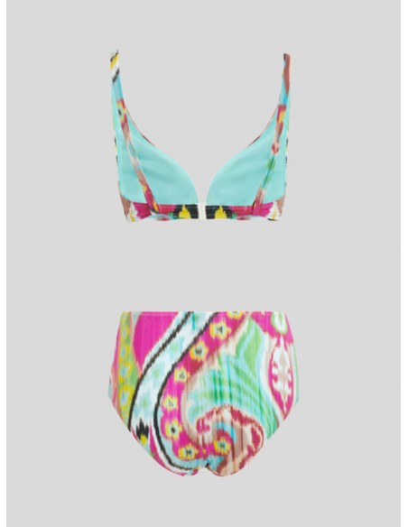 Bikini estampado con motivos geométricos multicolor en visión caleidoscópica ikat y realizado en tejido elástico que le otorga comodidad sin perder la figura. El bikini es de corte triangular con tirantes y gancho trasero. El culotte de tiro alto cerrando un estilo digno de los bañadores más retro.