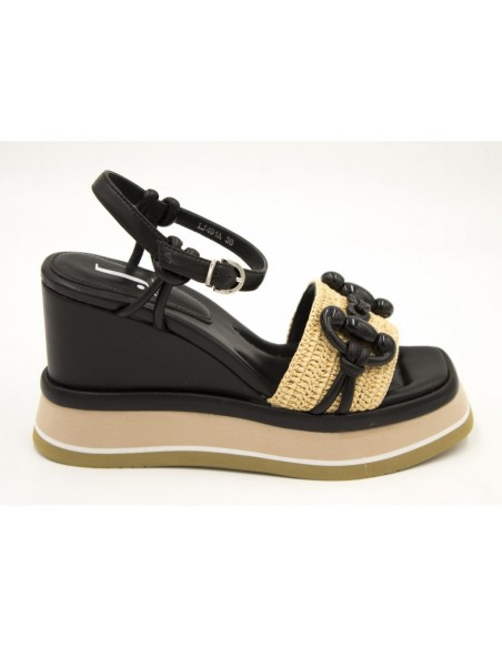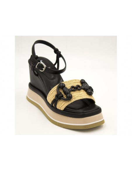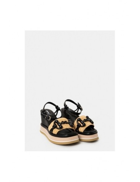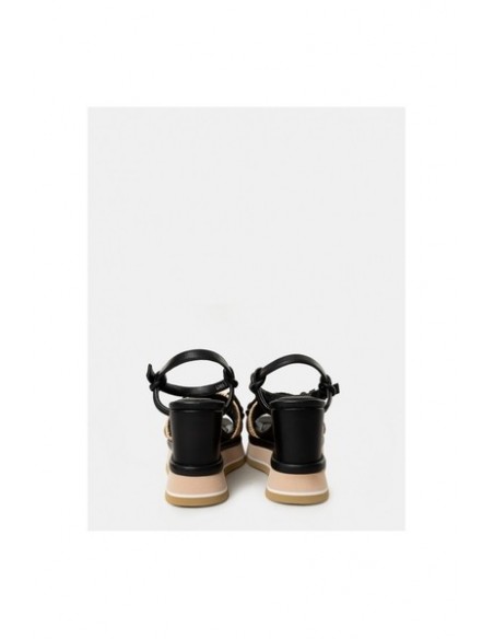 Sandalias de nappa negra con detalles de rafia que le aportan un toque muy veraniego. Son ideales para esta temporada de verano para soportar los calurosos dias de playa.