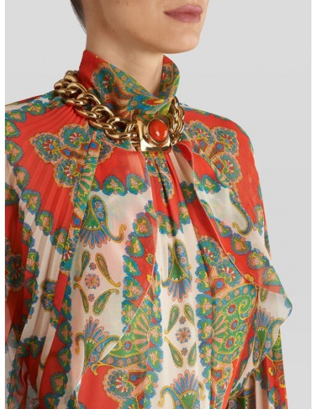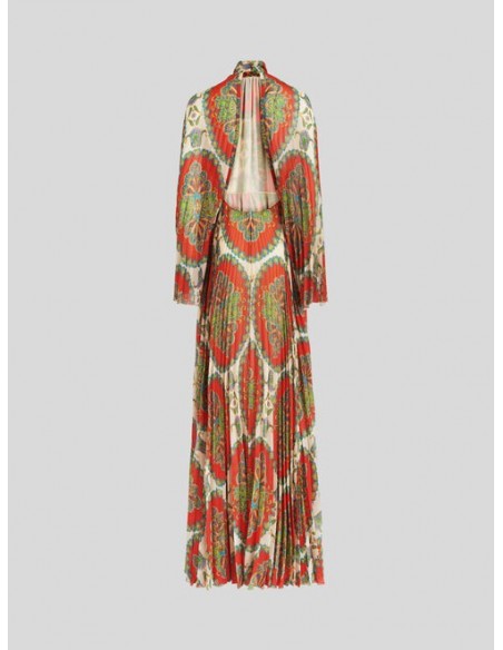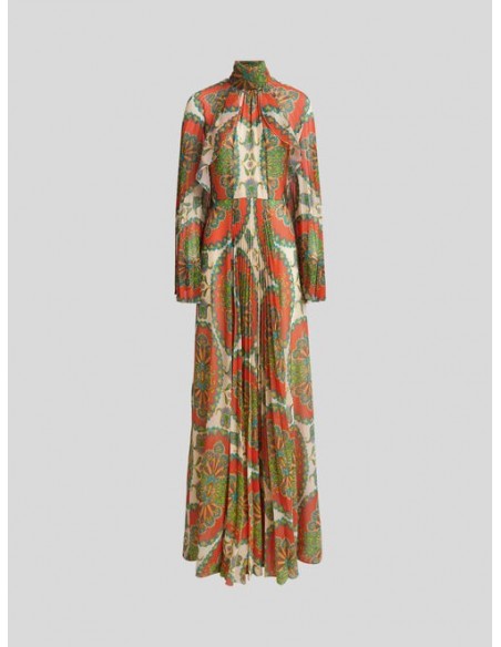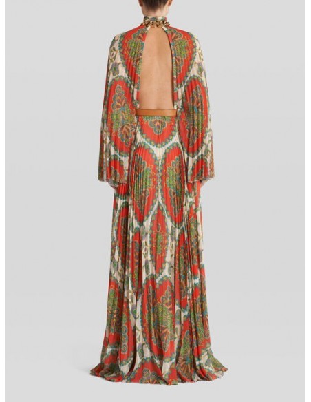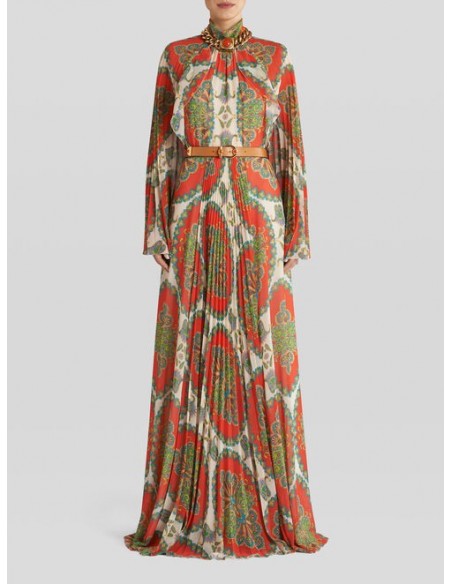 Esta prenda ha sido confeccionada en poliéster de la mejor calidad, ha sido diseñado con un corte regular de medida largo de georgette plisado, decorado con un estampado con medallones Paisley y embellecido con rouches que le dan el toque de lujo a la prenda. Este vestido de cuello alto cuenta con un escote trasero que deja la espalda al descubierto cerrado con una cremallera trasera oculta.