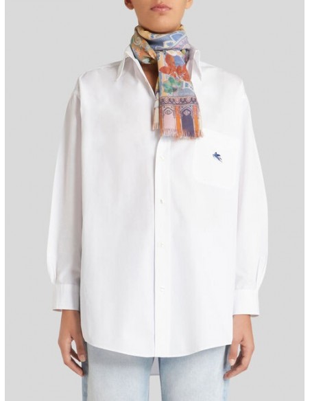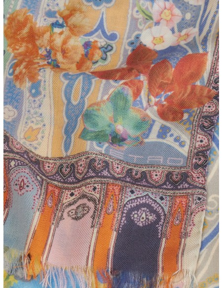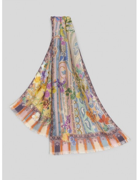 Este fular ha sido confeccionado en lana y seda especialmente seleccionada y decorada con motivos florales estampados y enmarcados por un borde arlequín ornamental desflecado.