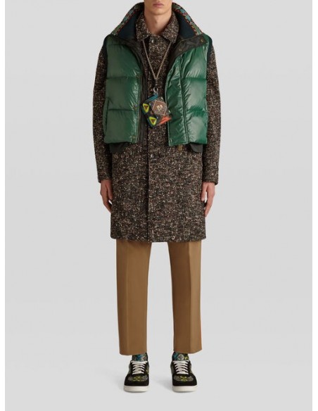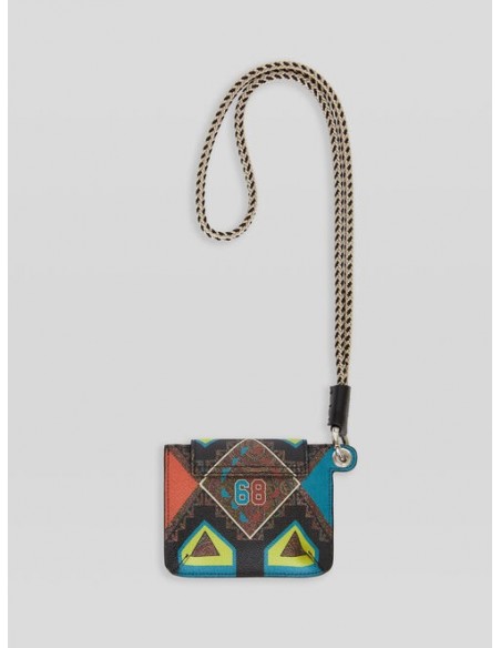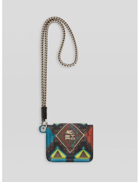 Tarjetero con correa desmontable confeccionado con el icónico tejido Paisley jacquard y adornado con motivos geométricos multicolor que le otorgan un toque juvenil a la prenda. El exterior del tarjetero esta confeccionado en tela de algodón jacquard recubierta con grano mate y doblada con tejido.