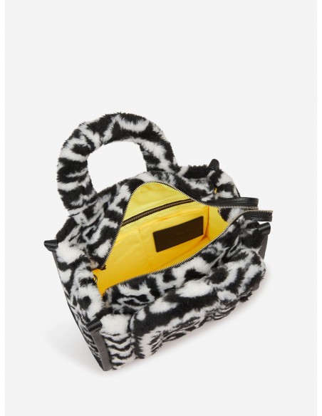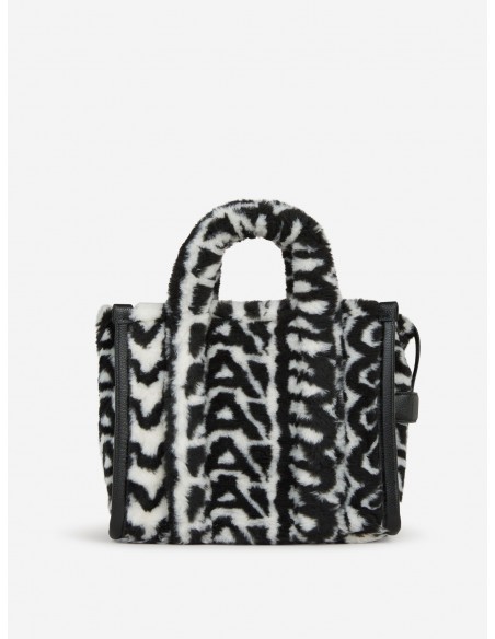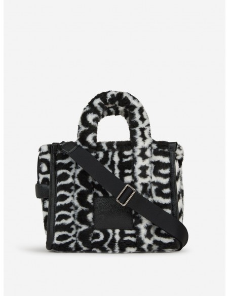 Este bolso de diseño con pelo artificial y piel de becerro es una declaración audaz de estilo. Cuenta con dos asas superiores y una correa extraíble para opciones versátiles de uso. El logo grabado en la parte frontal agrega autenticidad, mientras que el cierre mediante cremallera asegura tus pertenencias.