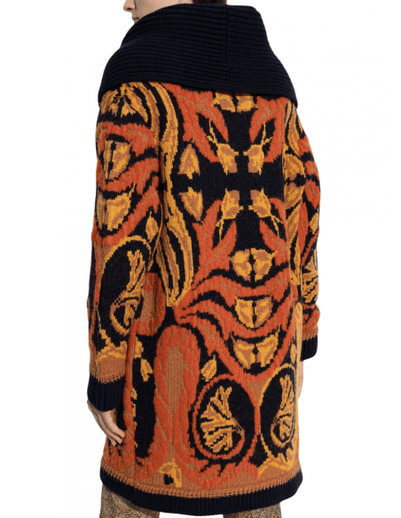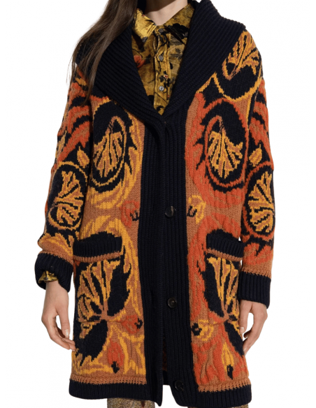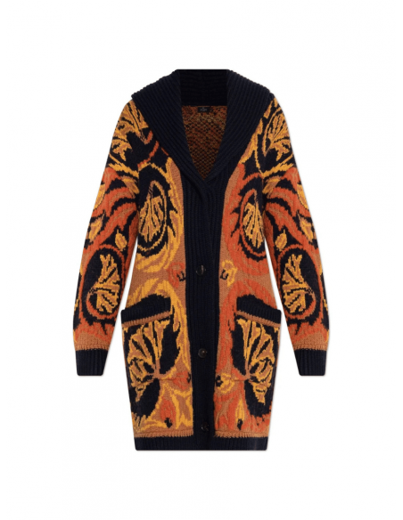 El Maxicárdigan de Lana y Algodón Jacquard de Etro combina la elegancia del motivo Paisley floral posicional con la comodidad de una silueta oversize. Confeccionado en una exquisita mezcla de lana y algodón, este diseño destaca por su cuello con solapas tipo chal, dos amplios bolsillos frontales y acabados de canalé, que aportan estructura y textura al conjunto. Perfecto para superponer sobre prendas básicas o vestidos, este maxicárdigan encarna el lujo artesanal y el espíritu bohemio característico de Etro.