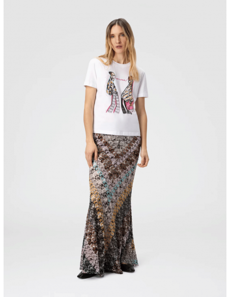 La camiseta de manga corta Missoni combina lo básico con un estilo inconfundible. Confeccionada en suave jersey 100% algodón, presenta un estampado gráfico en la parte delantera y logo bordado que aporta elegancia discreta. Su corte clásico y ligero la convierte en una prenda versátil e intemporal, perfecta para completar cualquier look, desde conjuntos casuales hasta combinaciones más elaboradas.
