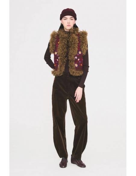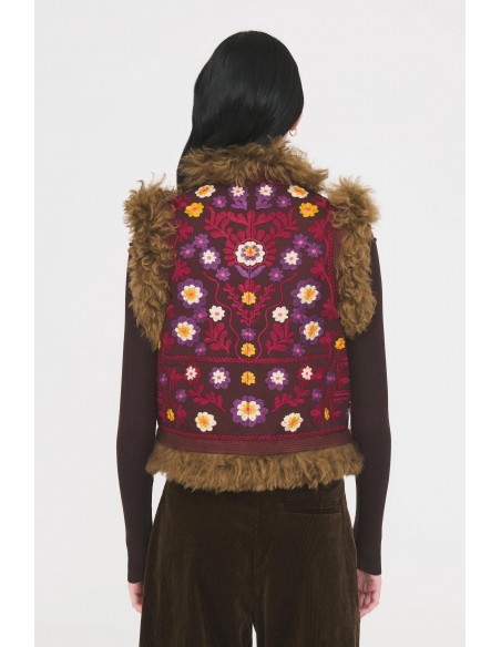 El Chaleco Húngaro de Antik Batik es una pieza artesanal de inspiración afgana que combina tradición y estilo contemporáneo. Confeccionado en color burdeos, destaca por su bordado floral hecho a mano en toda la prenda, aportando textura y riqueza visual. Los detalles en cuero de cordero en contraste refuerzan su carácter único, mientras que el forro de viscosa ultra suave garantiza confort absoluto.