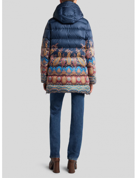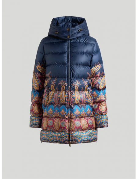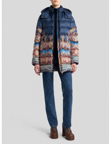 El Plumífero con Capucha y Estampado Posicional de Etro combina tecnicidad, elegancia y el inconfundible ADN artístico de la maison. Confeccionado en un suave tejido técnico, destaca por su motivo Paisley floral posicional que decora sutilmente la parte inferior del cuerpo y las mangas, aportando un aire sofisticado y distintivo. Su relleno de plumón de oca (80 %) y pluma (20 %) garantiza un confort térmico excepcional sin renunciar a la ligereza. Incorpora capucha ajustable con cordón, cierres metálicos con el emblema Pegaso en relieve y bolsillos laterales funcionales. Una prenda versátil y refinada que fusiona el espíritu bohemio de Etro con la funcionalidad contemporánea.