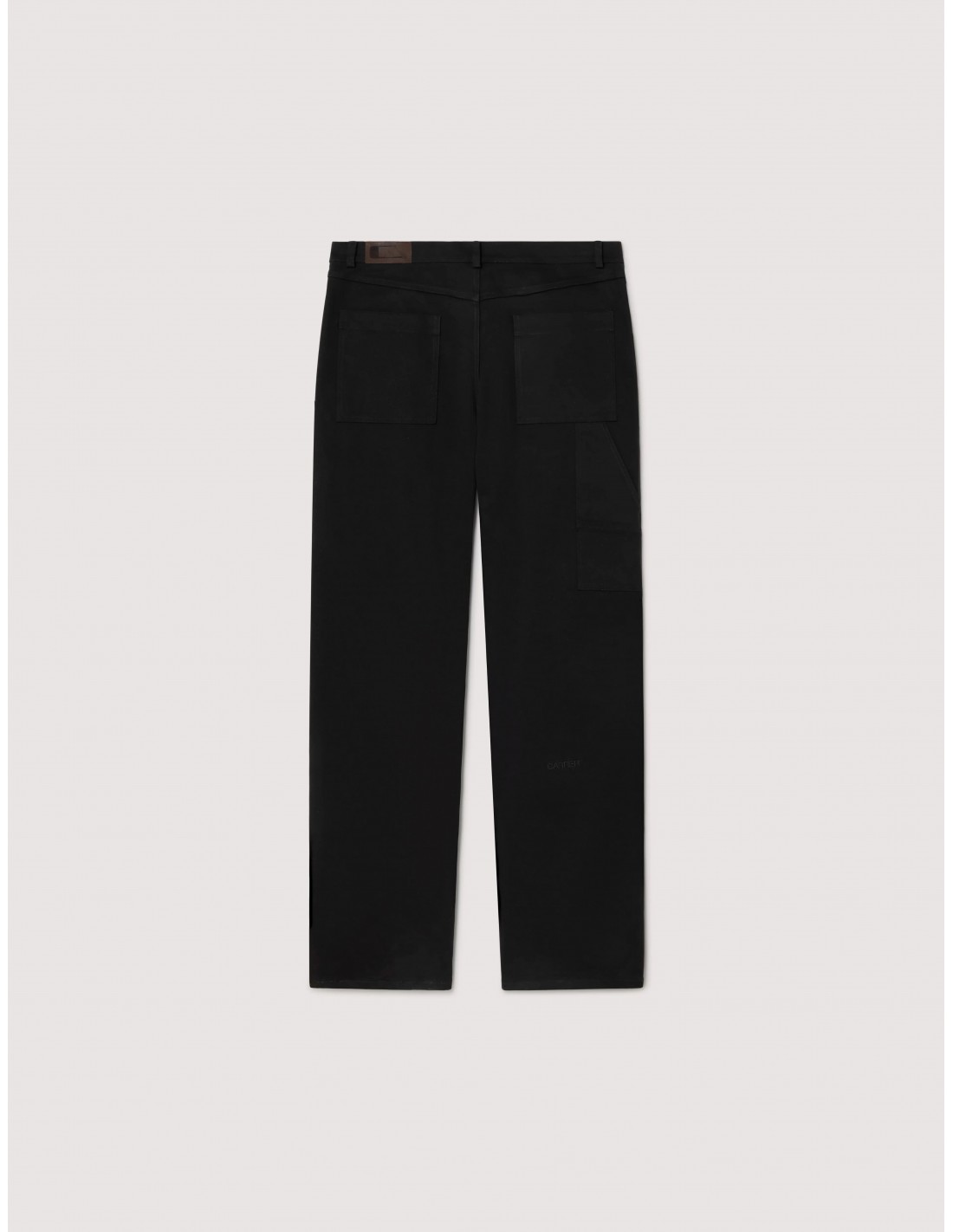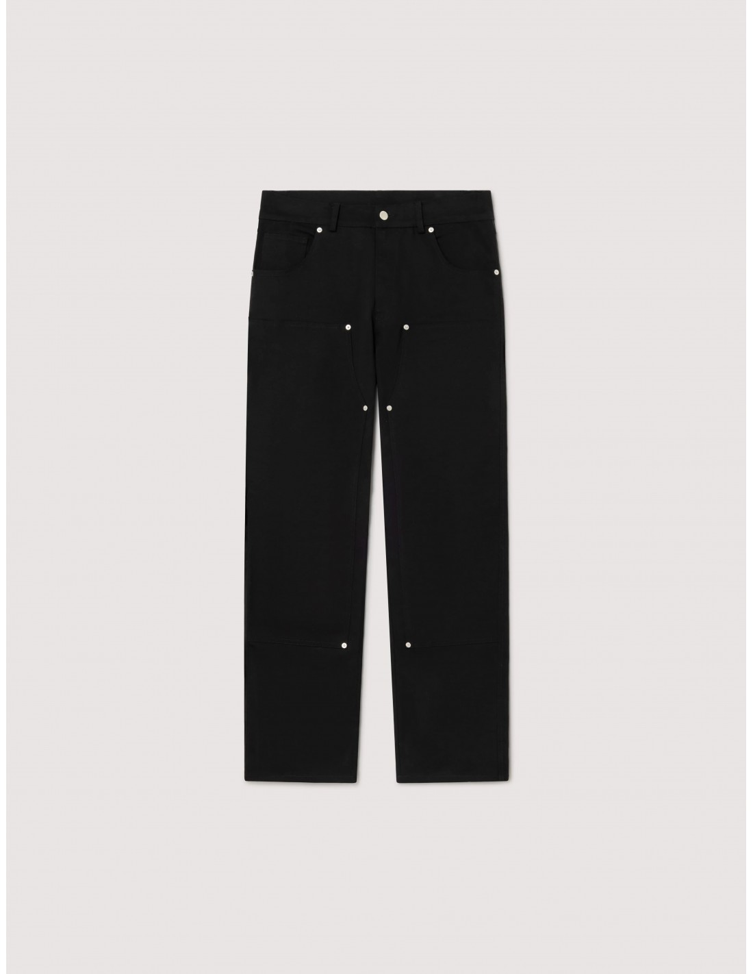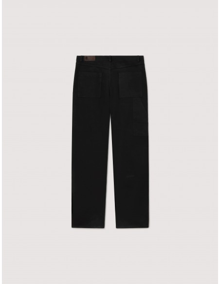 Este pantalón carpenter reinventa un clásico del workwear con un enfoque minimalista y actual. Confeccionado en una elegante construcción de doble tejido en negro sobre negro, incorpora remaches metálicos que aportan un sutil carácter industrial.