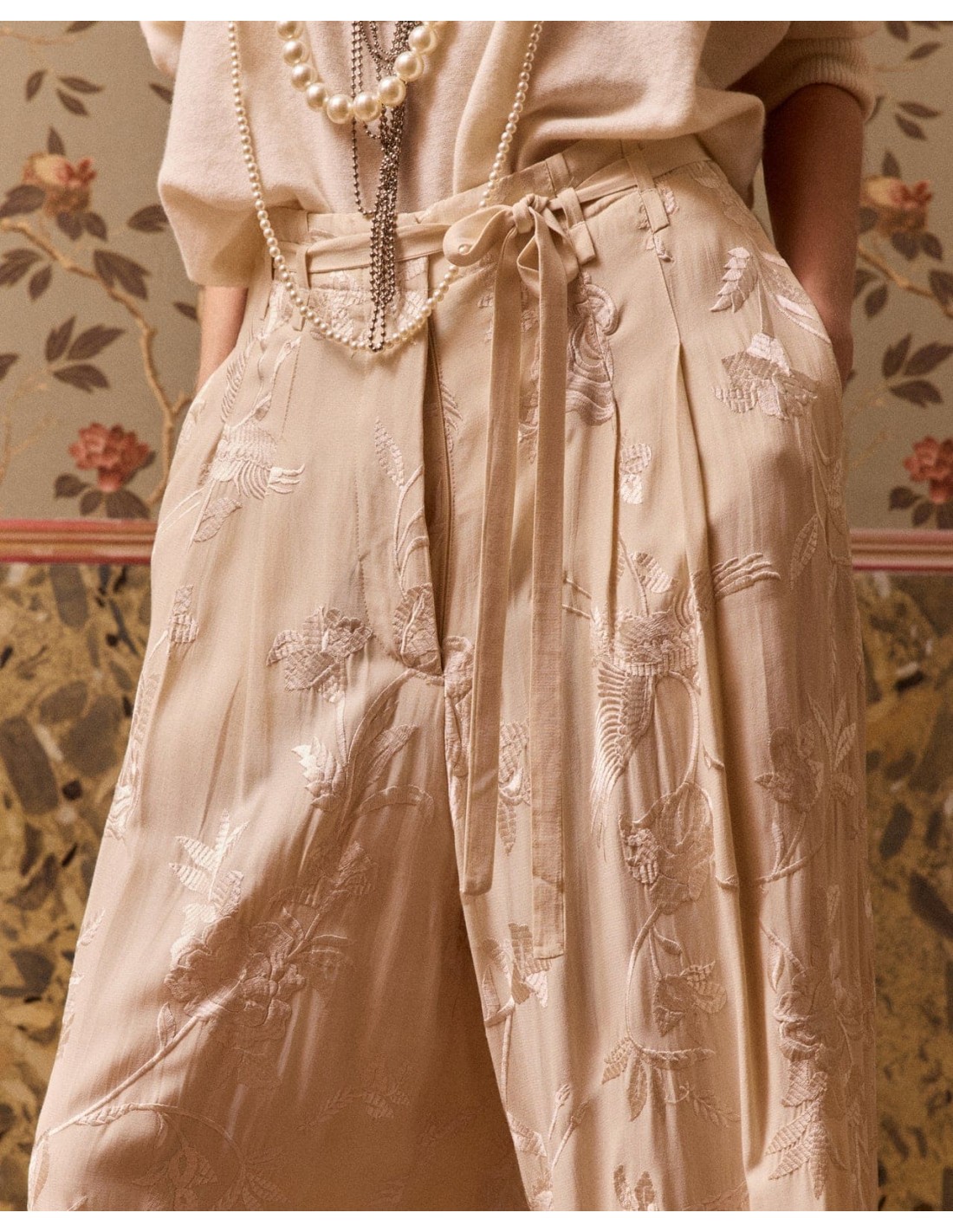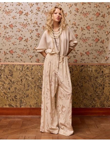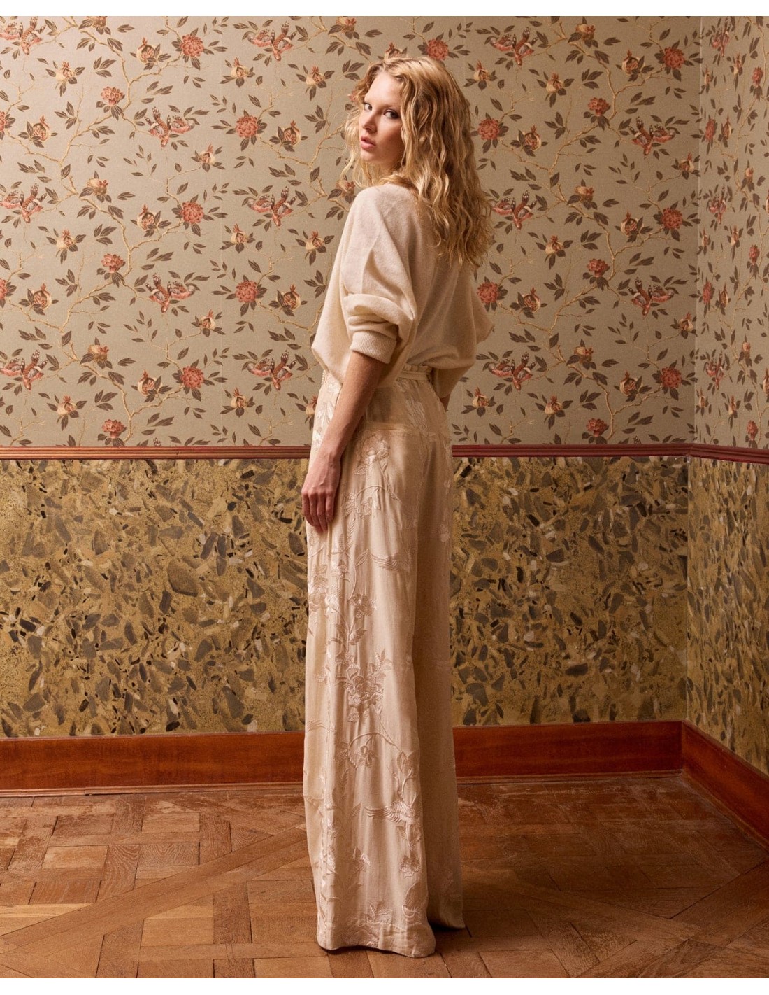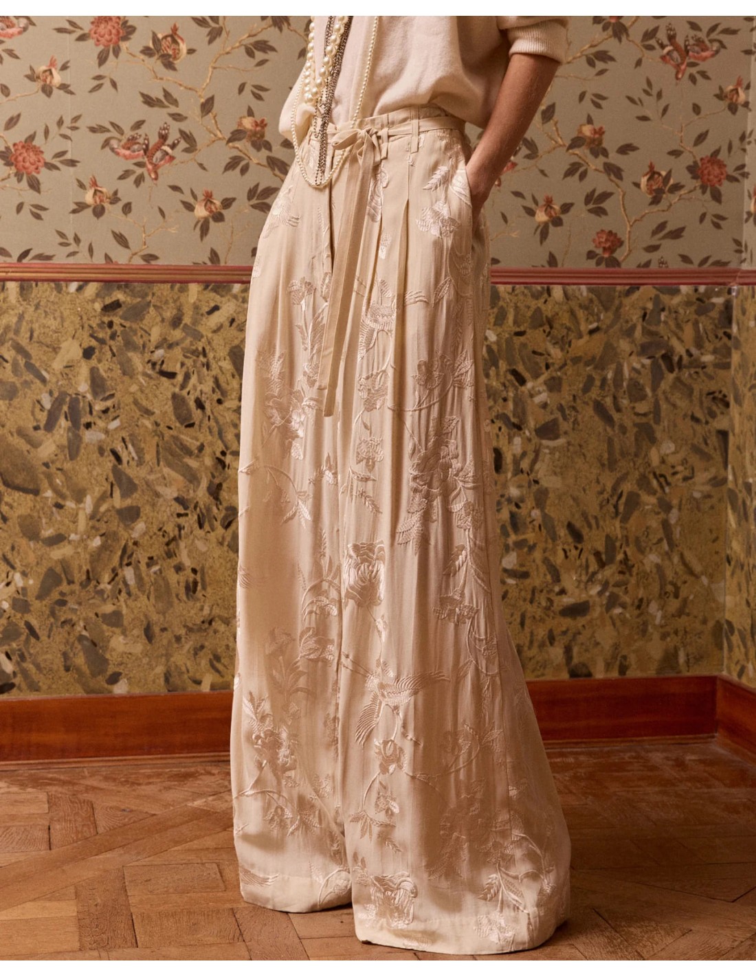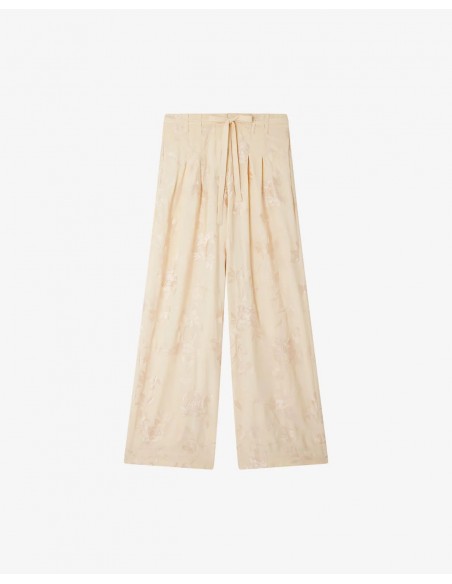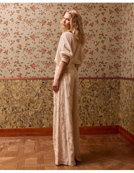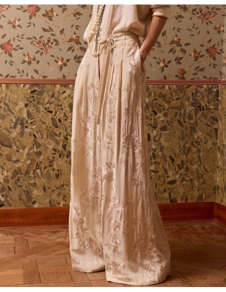 Descubre este pantalón fluido confeccionado en viscosa con bordado tono sobre tono en un suave color crudo. Su tejido ligero y su caída delicada aportan una sensación de frescura y elegancia.