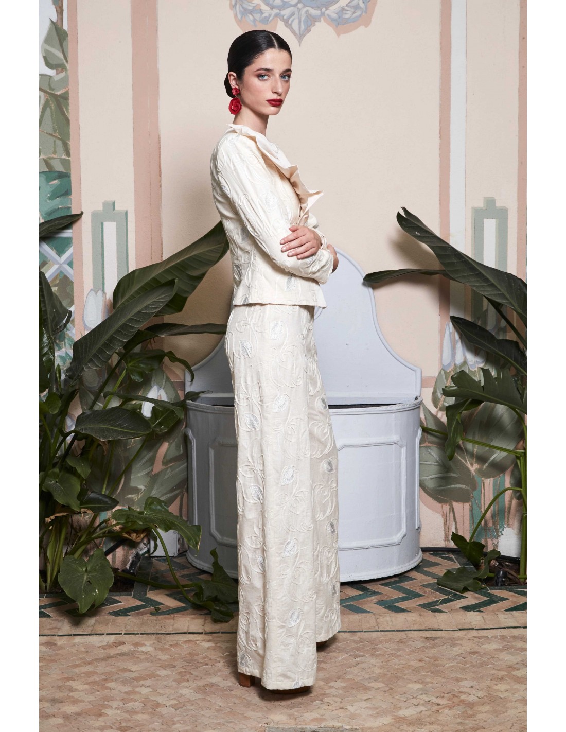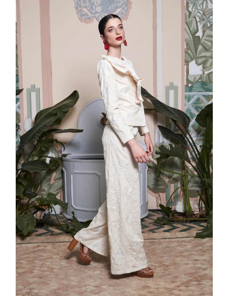 Descubre este pantalón confeccionado en tejido bordado con motivos florales en tonos crudos y plateados, que aportan un acabado delicado y luminoso. Su diseño de tiro alto y pernera amplia estiliza la silueta, creando una caída fluida y favorecedora que combina comodidad y elegancia.