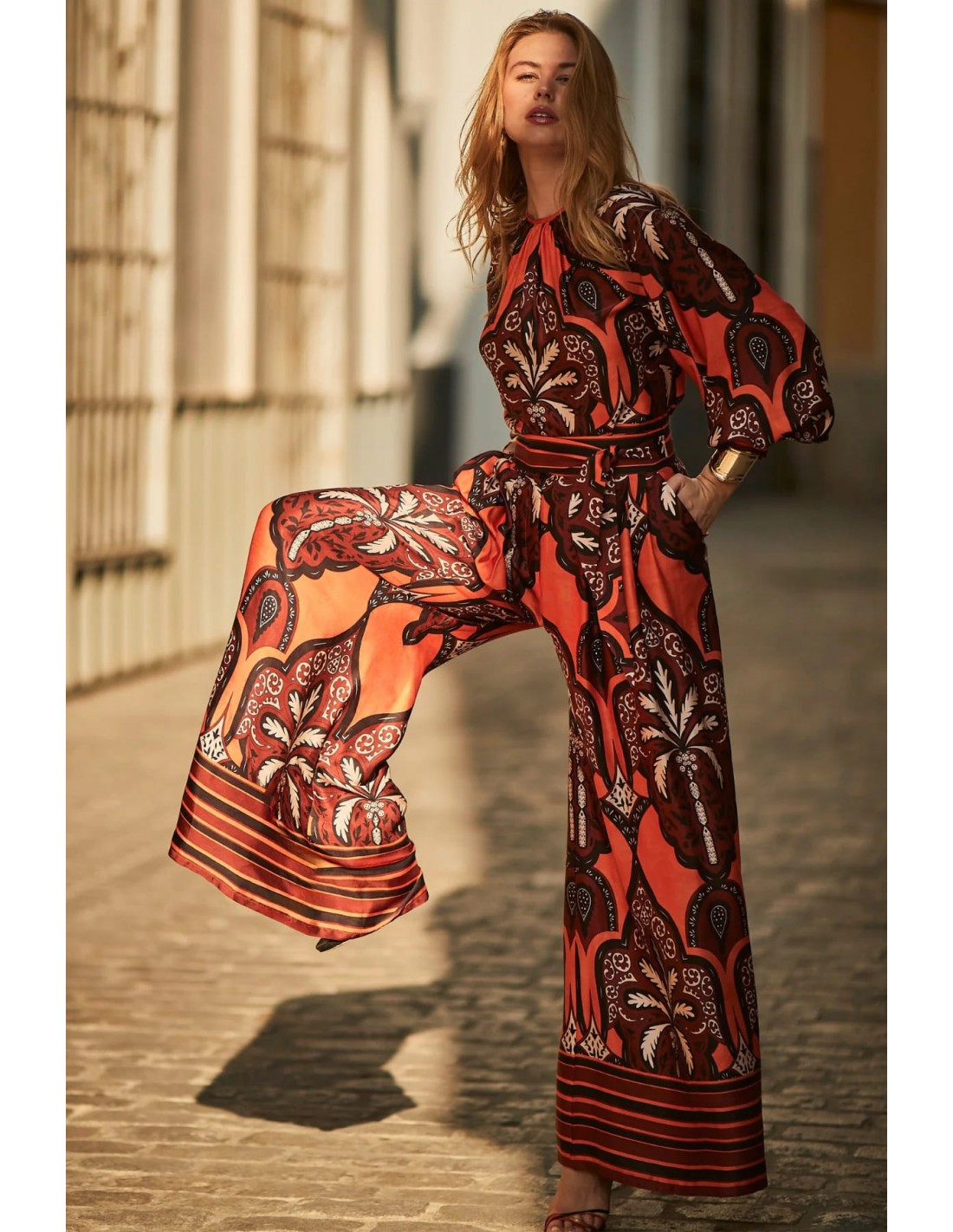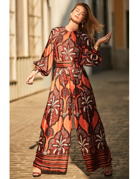 Descubre este pantalón de tiro alto confeccionado en viscosa con estampado en tonos cálidos, ideal para aportar estilo y personalidad a tus looks. Su pernera ancha y corte fluido estilizan la silueta, mientras que la cinturilla definida realza la figura con un ajuste favorecedor. El detalle de franjas en el bajo añade un toque distintivo y moderno.