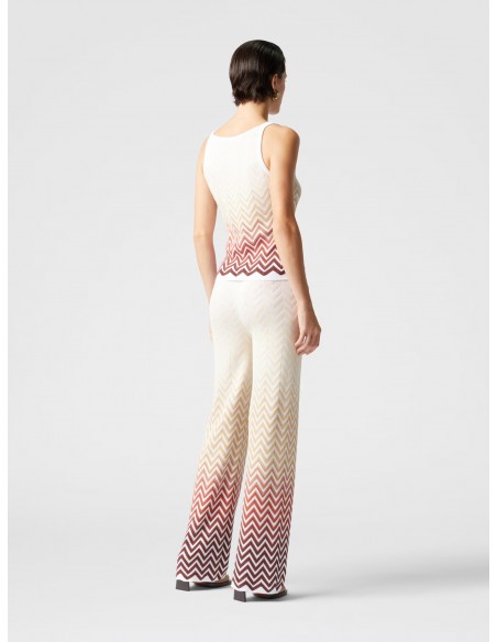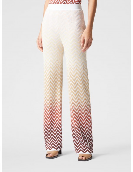 Estos pantalones rectos de jacquard encapsulan la esencia atemporal de Missoni, fusionando diseño icónico y confort impecable. Su estampado chevron degradado, característico de la firma, aporta un juego visual de color y textura que realza la silueta con elegancia.