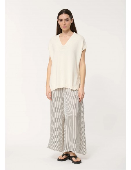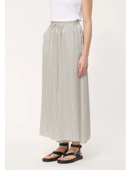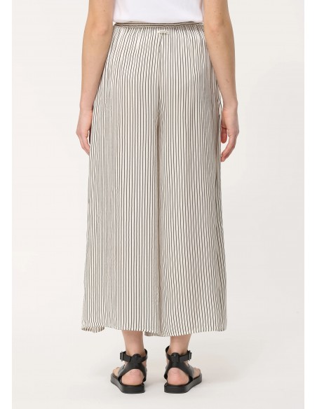 El pantalón culotte de rayas de Humility combina estilo relajado y comodidad con un toque sofisticado. Confeccionado en satén de viscosa Ecovero™, destaca por su tacto suave y caída fluida. Su diseño tipo falda-pantalón con corte amplio, cintura elástica y lazo ajustable lo convierte en una opción versátil tanto para el día como para la noche. El estampado de rayas estiliza la silueta, mientras que su largo de 60 cm aporta un aire moderno y desenfadado. Ideal para combinar con camisetas básicas o blusas estructuradas.