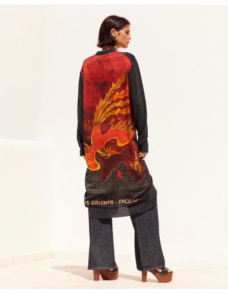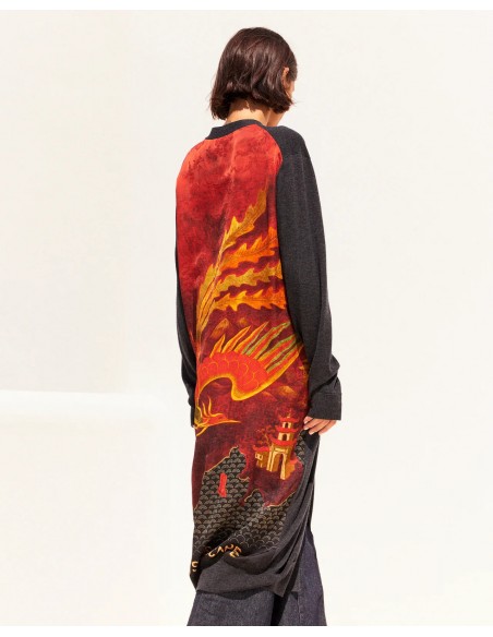 En la parte posterior, un panel de viscosa jacquard introduce un contraste sorprendente y elegante: un motivo de dragón colocado, gráfico y simbólico, que transforma esta prenda en una pieza singular.