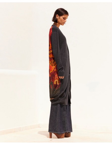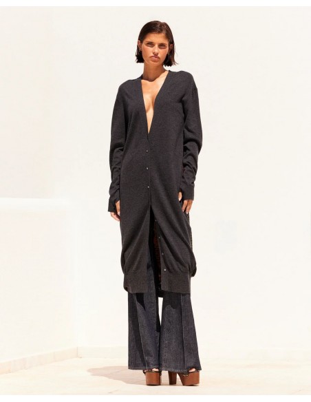 El Manteau Flyn de Mes Demoiselles es un cardigan largo que combina sobriedad y carácter en un mismo diseño. Confeccionado en lana merino de punto fino en un tono charcoal profundo e intemporal, presenta una silueta fluida con escote en V y botonadura discreta, ideal para un look estilizado y versátil.
