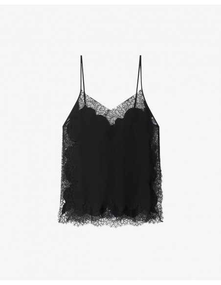 Está adornado con una fina puntilla tono sobre tono que realza delicadamente el escote y los bordes, aportando una feminidad sutil y elegante. Sus tirantes finos y ajustables permiten un ajuste perfecto.