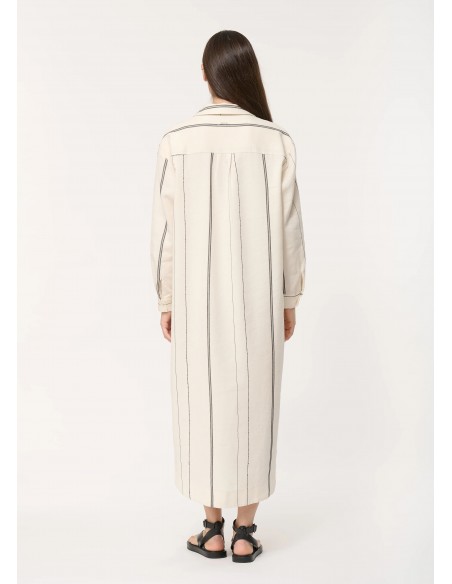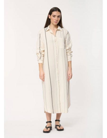 El vestido camisero a rayas midi de Humility es la prenda ideal para un look relajado con un toque clásico. Su diseño oversize con volumen amplio en el lado derecho y escote tipo chemise crea una silueta moderna y confortable. Confeccionado en una mezcla ligera de algodón, viscosa, lino y poliéster, ofrece frescura y movimiento. Presenta mangas largas con puños abotonados, sisas caídas, un bolsillo de parche en el pecho y cierre frontal con botones. El largo midi de 130 cm lo convierte en una opción versátil para looks urbanos o más sofisticados.