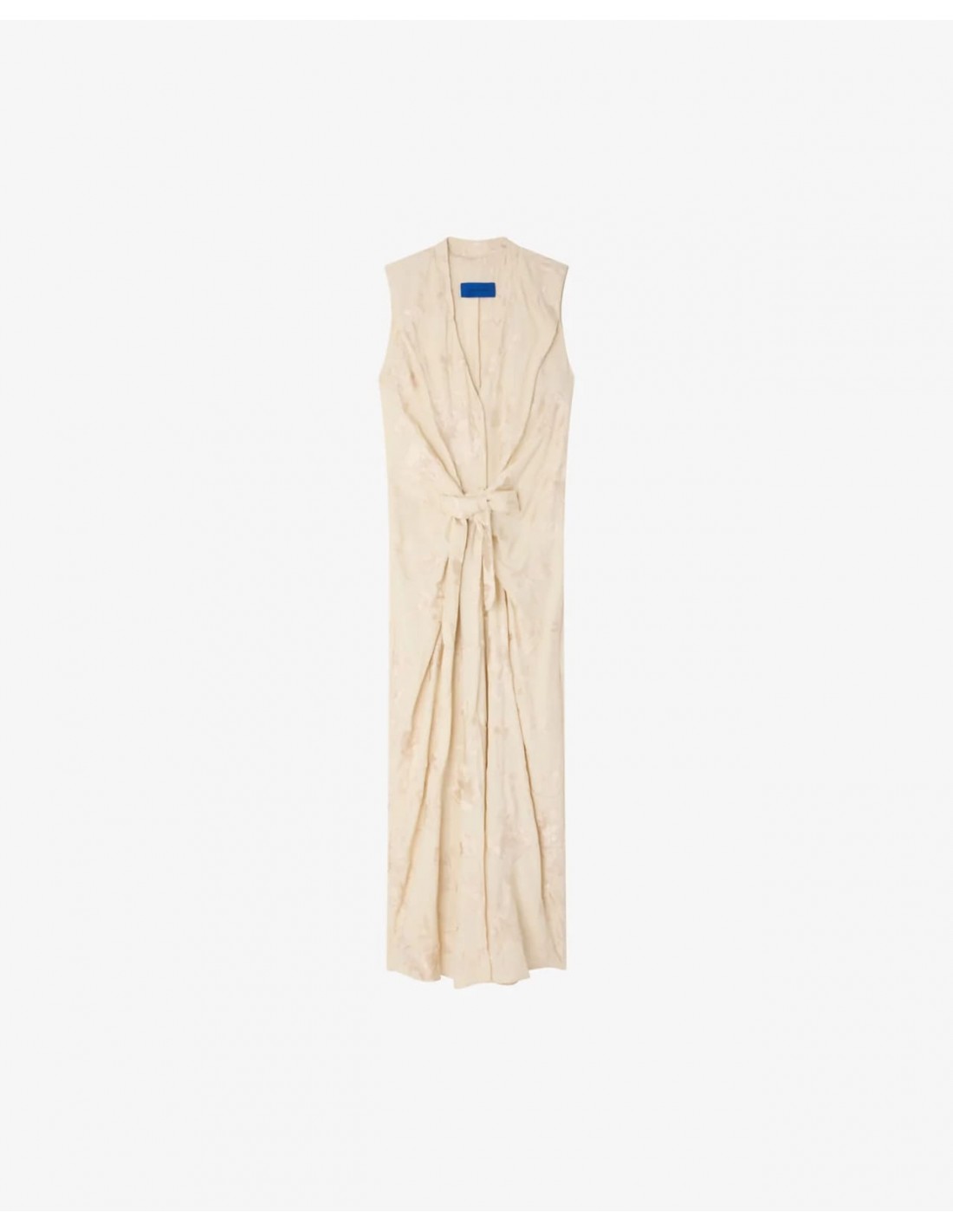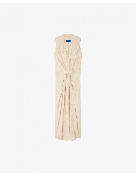 Descubre este vestido largo confeccionado en viscosa ligera con bordado, realzado por un delicado motivo floral tono sobre tono sobre fondo crudo claro o por un estampado blanco en contraste sobre fondo negro profundo. Su escote en V y su diseño sin mangas crean una silueta elegante y femenina, mientras que el lazo ajustable en la cintura estructura la prenda y realza la figura de forma natural.