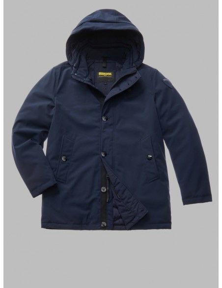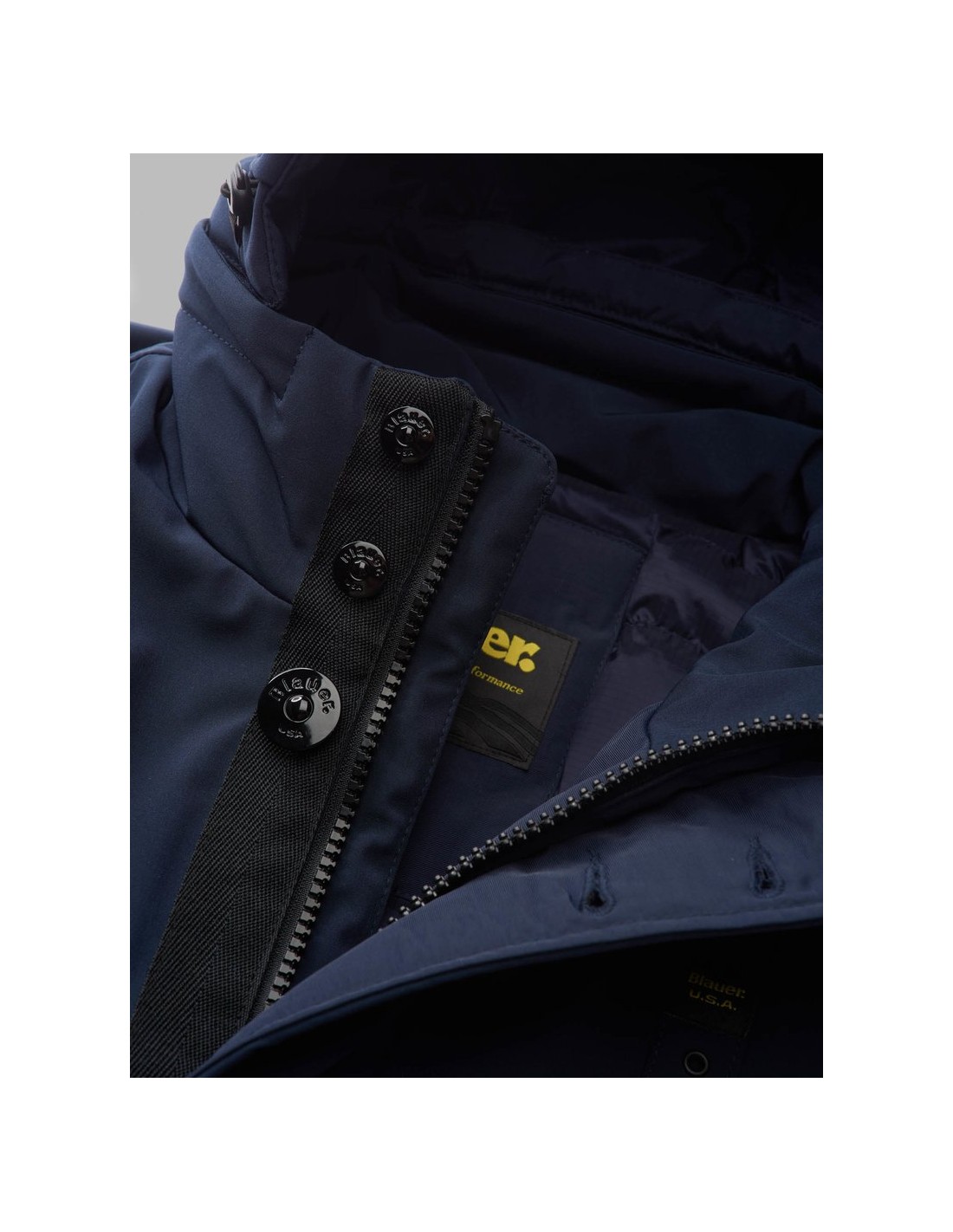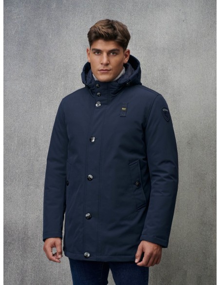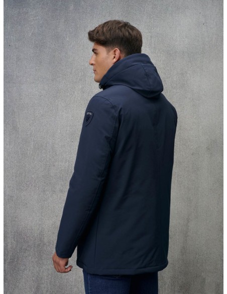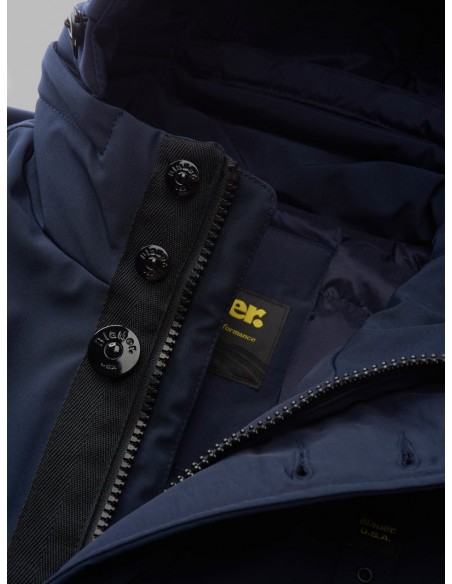 La parka larga de neopreno de Blauer combina estilo militar con funcionalidad moderna. Repelente al agua y con cuello alto y capucha desmontables, es versátil y perfecta para el frío gracias a su relleno de pluma 90/10 ligero pero cálido. Confeccionada en neopreno ligero con forro de nylon micro rip, incluye cierre de cremallera, botones de presión y bolsillos prácticos. Los detalles como el parche y el pasador con logo aportan un toque distintivo. Ideal para quienes buscan protección y estilo en una sola prenda.