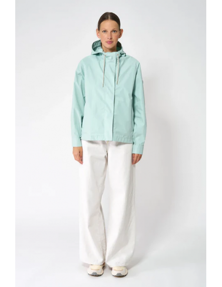 El chubasquero Dhuda Blue Haze de Tanta es una chaqueta corta impermeable diseñada para ofrecer protección y estilo con un corte holgado que favorece la comodidad. Confeccionada en una mezcla de algodón (78%) y nailon (22%) con acabado repelente al agua, garantiza transpirabilidad y resistencia al viento gracias a su recubrimiento PU interno y costuras selladas con hilos impermeables. Destacan sus mangas raglán oversize con puños ajustables, capucha con visera y cordón, y una cremallera frontal de doble cursor con cierres a presión ocultos para un acabado limpio. Cuenta además con aberturas laterales redondeadas que aportan un toque femenino y bolsillos con cremalleras impermeables.