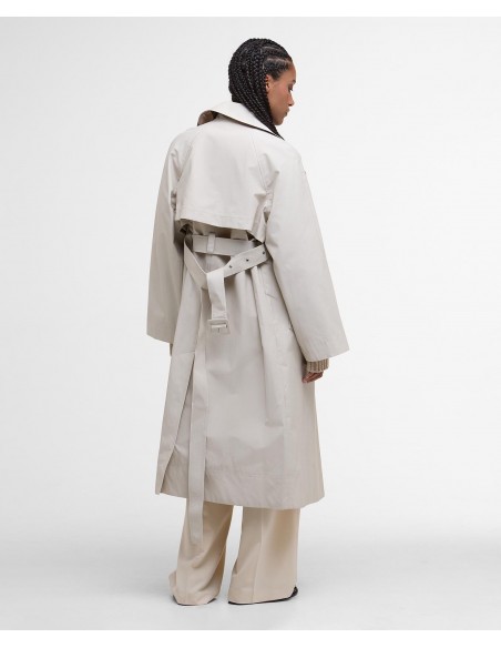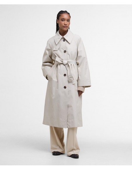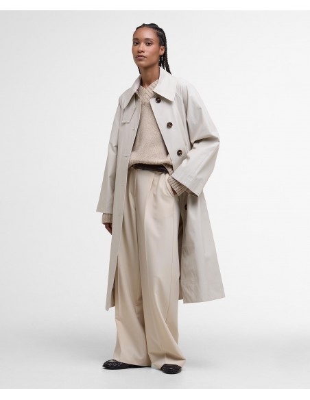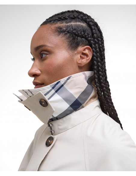 Su diseño presenta un cuello amplio y mangas de corte generoso, aportando un aire moderno y desenfadado. El cinturón del mismo tejido permite ajustar la silueta a la cintura, realzando la figura con sutileza. El cierre frontal con botones mantiene la estética clásica, mientras que el forro interior de tartán Barbour rinde homenaje al inconfundible legado de la firma.