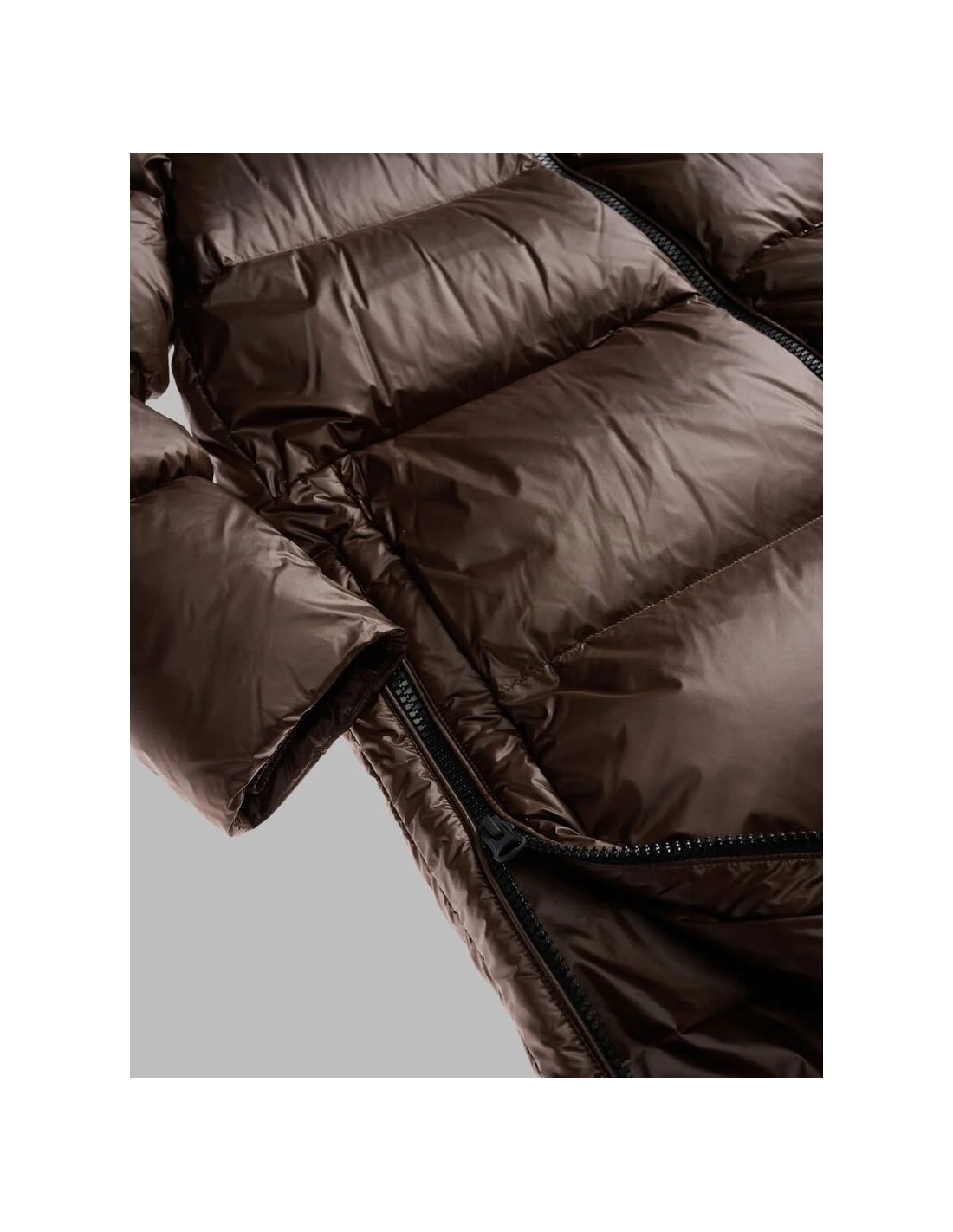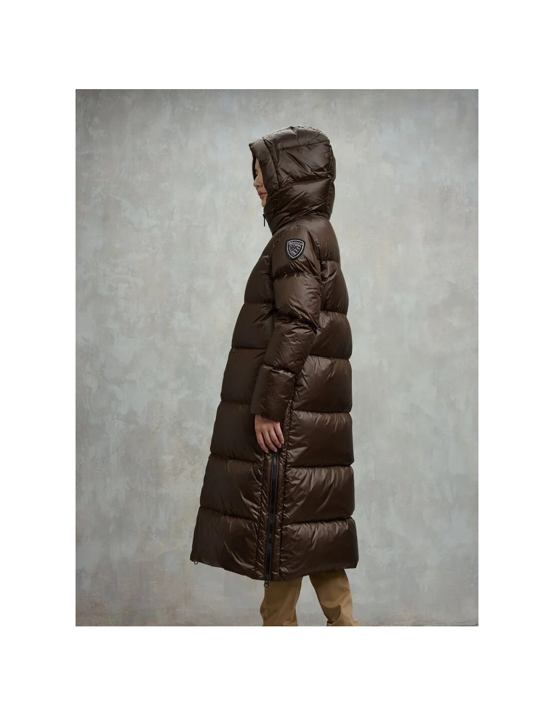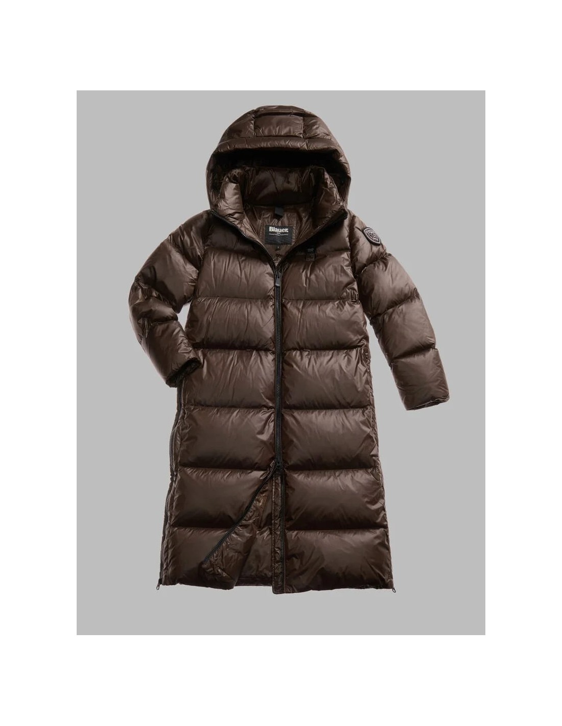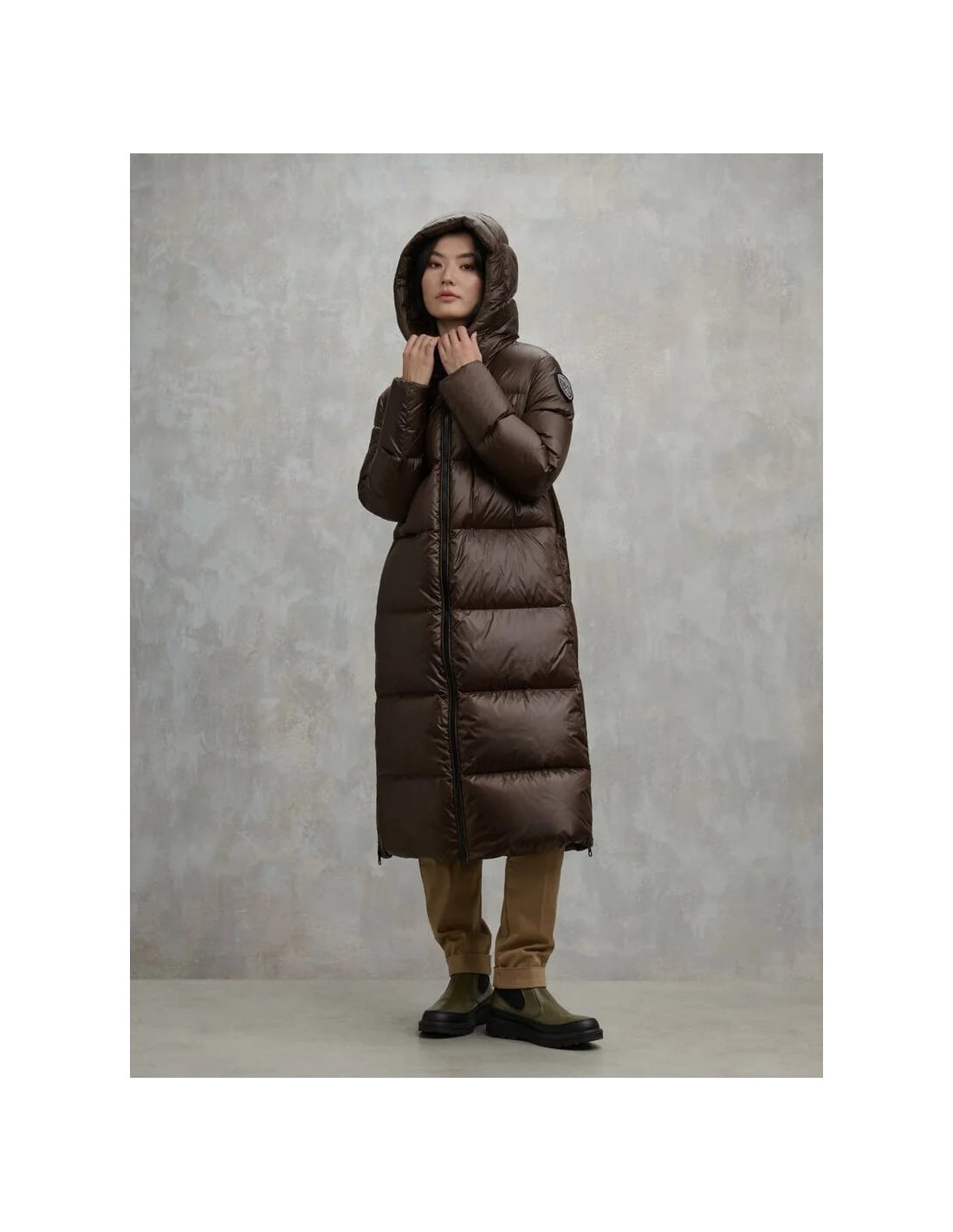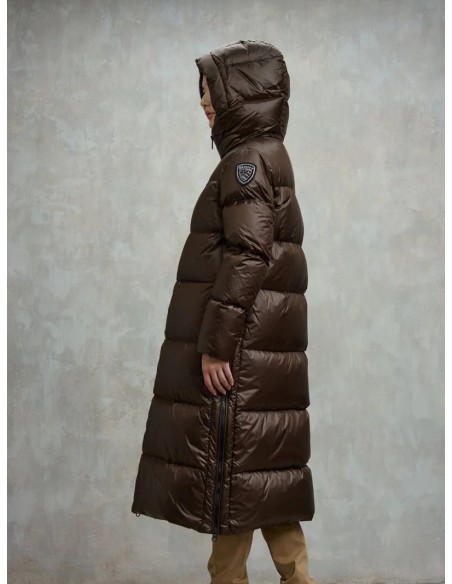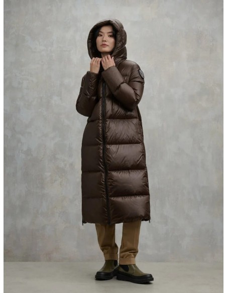 Chaqueta larga de plumón 90/10 (345 g) en nylon brillante, suave y cálida, con acolchado horizontal y aberturas laterales con cremallera para mayor comodidad al caminar. Incluye capucha fija, cuello interno, forro a tono y doble puño con elástico para un mejor aislamiento. Presenta cierre de cremallera, bolsillos invisibles con zip y bolsillos interiores con Velcro. Detalles exclusivos como el patch glitter y el logo loop completan un diseño funcional, moderno y perfecto para el invierno.