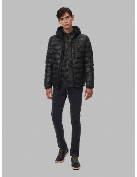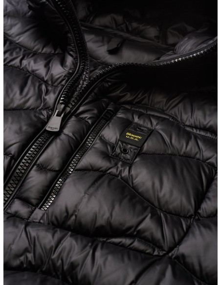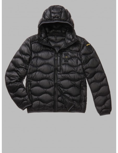 Plumífero cálido pero ligero, de nailon brillante microrip con capucha, pespunteado de ondas horizontales.