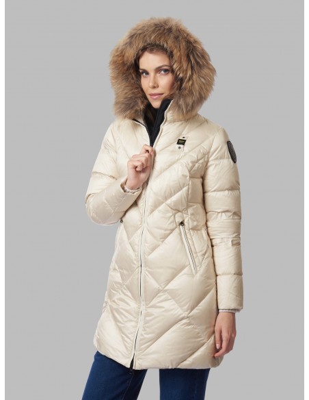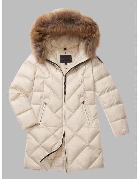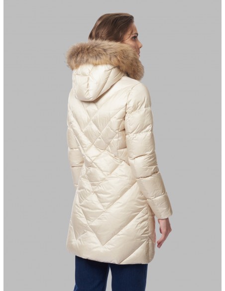 Plumífero largo de nailon pespunteado de líneas geométricas con capucha fija y ribete de piel de mapache extraíble mediante cremallera.