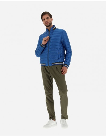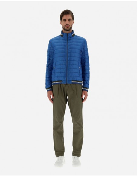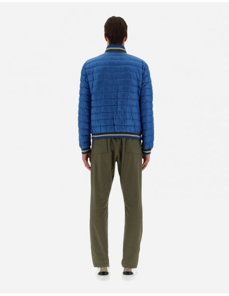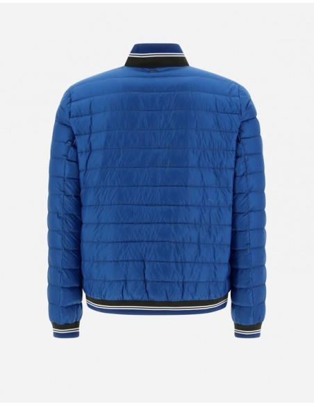Cazadora bomber confeccionada con un material innovador que es altamente resistente al agua y proporciona una sensación muy lujosa, similar a la seda. Esta prenda luce un diseño minimalista con bajos de punto a rayas que le dan un toque deportivo al look.
