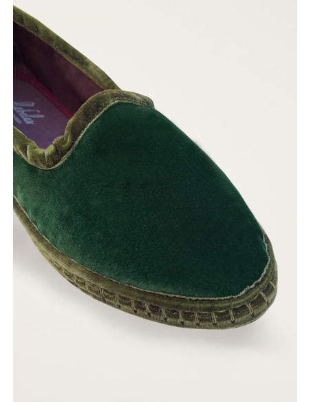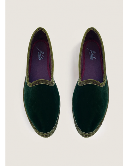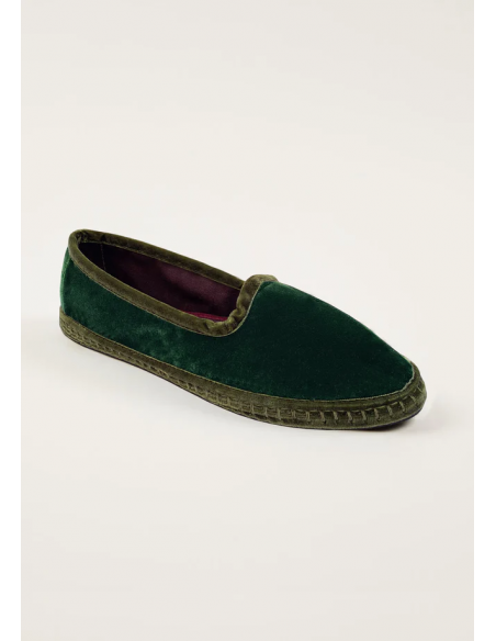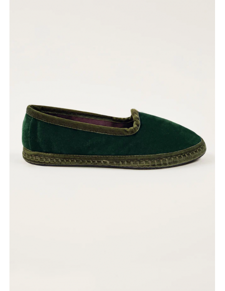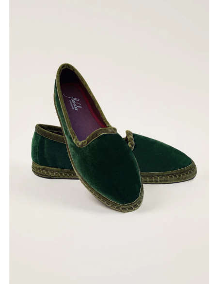 Este calzado presenta un hermoso color verde combinado con un ribete de terciopelo, lo que lo hace elegante y distintivo. El zapato exterior está confeccionado con terciopelo de algodón 100% orgánico, lo que refleja una elección sostenible de materiales.