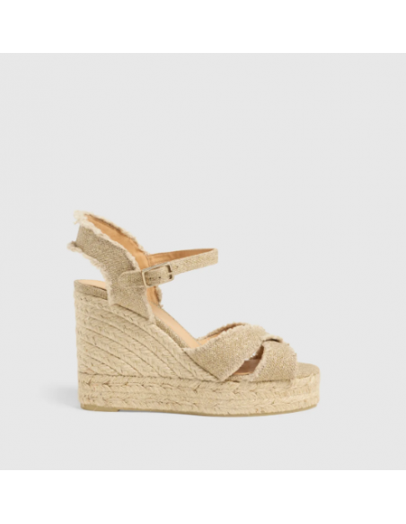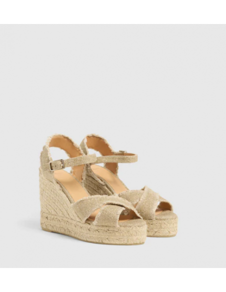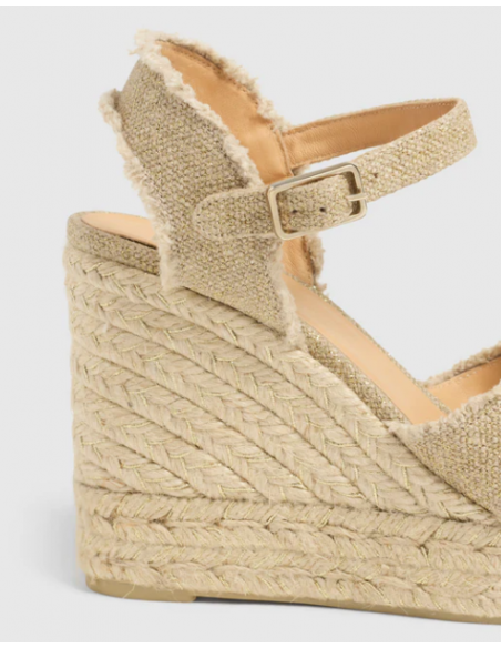 Las alpargatas bromelia cuenta con un detalle frontal cruzado y un divertido desflecado que despunta captando todas las miradas. Confeccionadas en España en lino metalizado, presentan puntera abierta redondeada, cierre lateral de pulsera con hebilla metálica, abertura en la parte porterior del talón, cuña de 11cm con doble plataforma de yute y suela de caucho vulcanizado