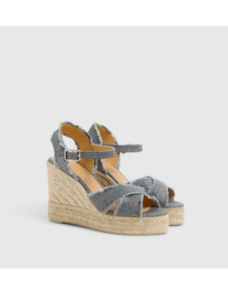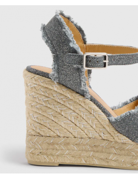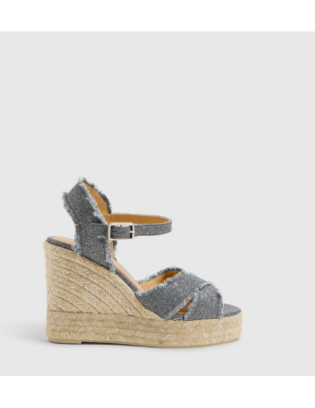 Las alpargatas bromelia cuenta con un detalle frontal cruzado y un divertido desflecado que despunta captando todas las miradas. Confeccionadas en España en lino metalizado, presentan puntera abierta redondeada, cierre lateral de pulsera con hebilla metálica, abertura en la parte porterior del talón, cuña de 11cm con doble plataforma de yute y suela de caucho vulcanizado