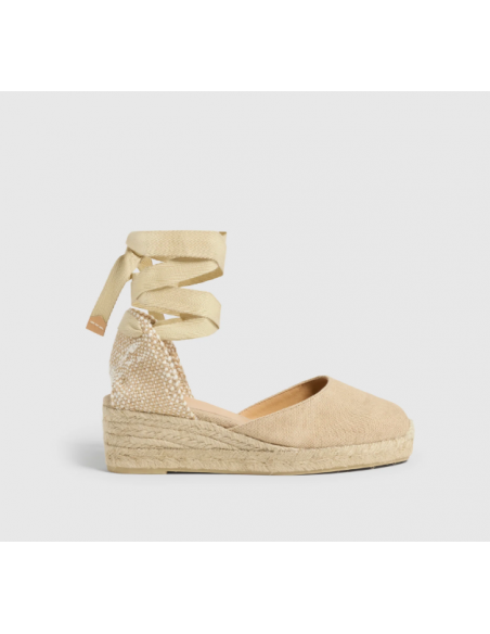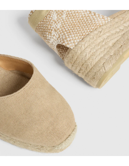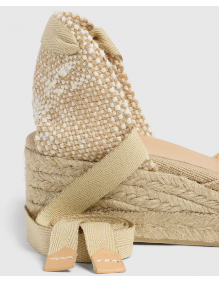 Alpargatas con cuña confeccionadas en lona de algodón, creando un calzado ideal para cualquier ocasión. Esta diseñada con talonera de tejido trenzado con acabado en cierre de cintas para atar al tobillo. Esta alpargata esta realizada con acabado de punta redonda y suela vulcanizada en yute de color natural y en caucho.