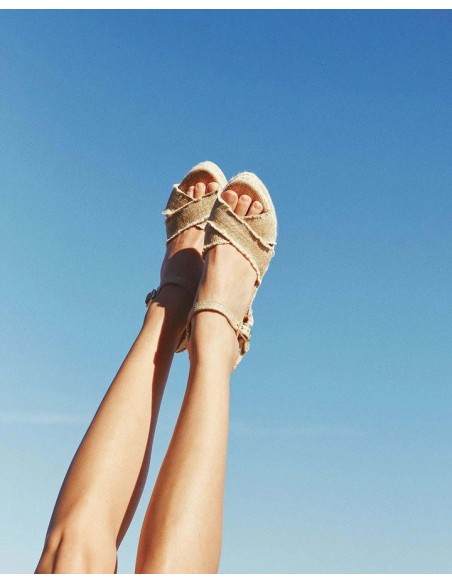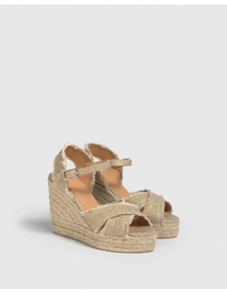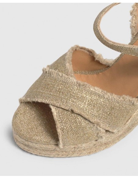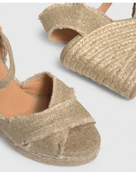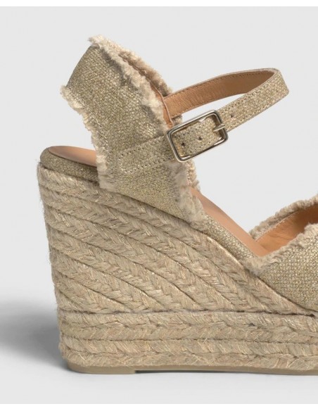 Suela vulcanizada de yute color natural, lúrex dorado y caucho.
