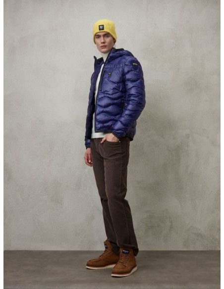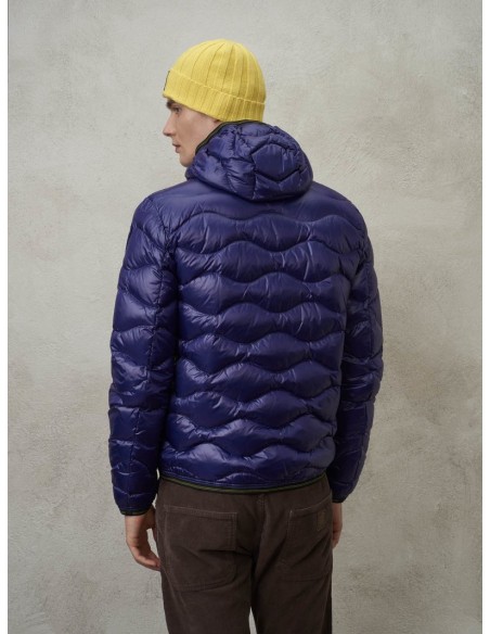 Este plumífero combina calidez y ligereza en un diseño de nailon brillante micro-rip con una capucha, pespunteado con ondas horizontales que añaden un toque de estilo único.